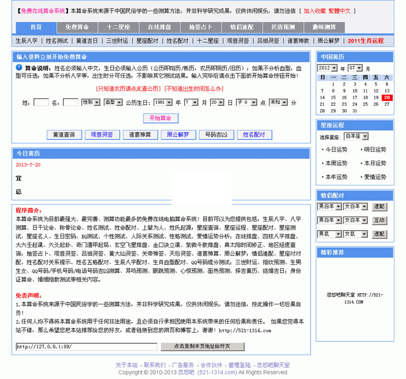 1.本算命系统来源于中国民俗学的一些测算方法,并非科学研究成果,仅供休闲娱乐,请勿迷信,按此操作一切后果自负!