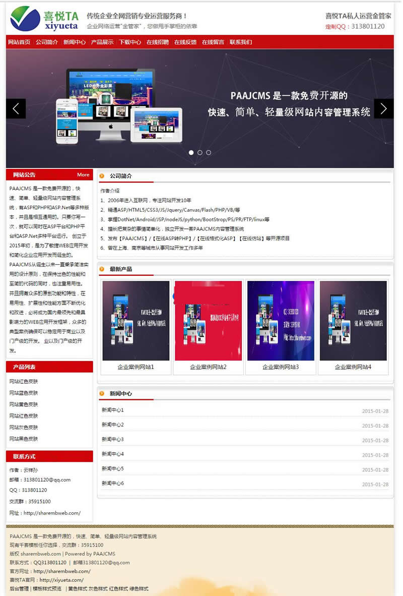 PAAJCMS 是一款免费开源的,快速、简单、轻量级网站内容管理系统,有ASP和PHP和ASP.Net等多种版本,并且是相互通用的。只要你写一次,就可以同时在ASP平台和PHP平台和ASP.Net多种平台运行。 创立于2015年初,是为了敏捷WEB应用开发和简化企业应用开发而诞生的。PAAJCMS从诞生以来一直秉承简洁实用的设计原则,在保持出色的性能和至简的代码的同时,也注重易用性。 并且拥有众多的原创功能和特性,在易用性、扩展性和性能方面不断优化和改进,必将成为国内最领先和最具影响力的WEB应用开发框架,众多的典型案例确保可以稳定用于商业以及门户级的开发。 业以及门户级的开发。