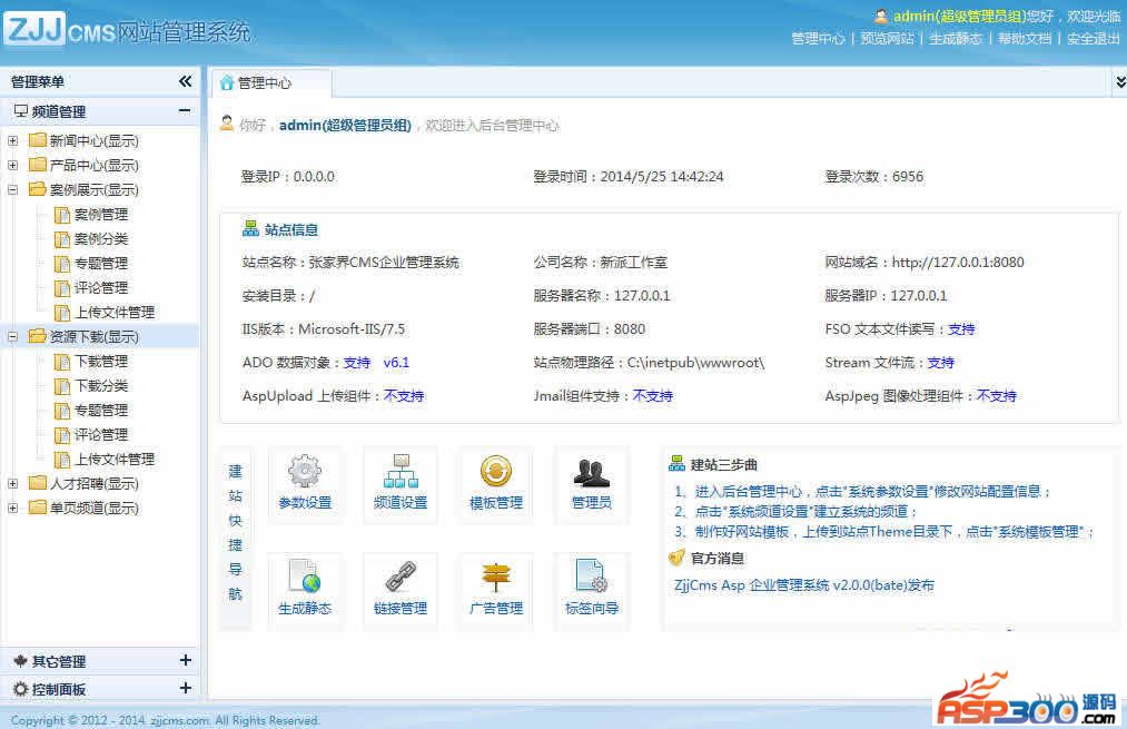 张家界企业网站管理系统(zjjcms)是由新派工作室基于asp+access/mssql自主研发而成。我们致力于中小企业网站的搭建。根据现有企业的需求。开发适合企业的模块,让企业可以轻松搭建适合自己企业的网站,后台功能强大,管理便捷。代码简单易懂,适合二次开发。我们认为“简单就是美”,因此一直以来,新派工作室在开发过程中无处不充分考虑用户的使用习惯,尽最大可能降低用户的使用门槛,让用户关注于内容维护本身,而不需 要投入过多的时间来学习系统的使用技巧,在细节处下大工夫。功能特点:1.站点采用UTF-8国际编码2.程序与模版完全分离,懂美工就能使用。。3.全站生成html,灵活的标签调用。4.全局设置功能(可以设置企业的基本信息)5.留言功能6.幻灯图片管理7.友情链接:可支持logo链接,和文字链接。可支持批量删除。8.强大的广告功能。9.自定义频道、标签、模版、字段等功能。10.专题功能11.强大的生成html功能(支持一键生成全站)。12.数据库在线处理(只对Access数据库:数据压缩 | 数据备份 | 数据恢复 | 批量替换)。13.图片生成缩略图,水印图(文字水印,图片水印)14.文件上传管理.15.后台管理员权限级别管理16.前台标签调用简单,支持自定义字段调用。17.标签向导,让你调用标签随心所欲18.模板在线增删改查.让你省去使用FTP19.开源免费,源码完全无加密开发,免去了您的后顾之忧,程序可免费无限制使用,但是禁止包皮发布。