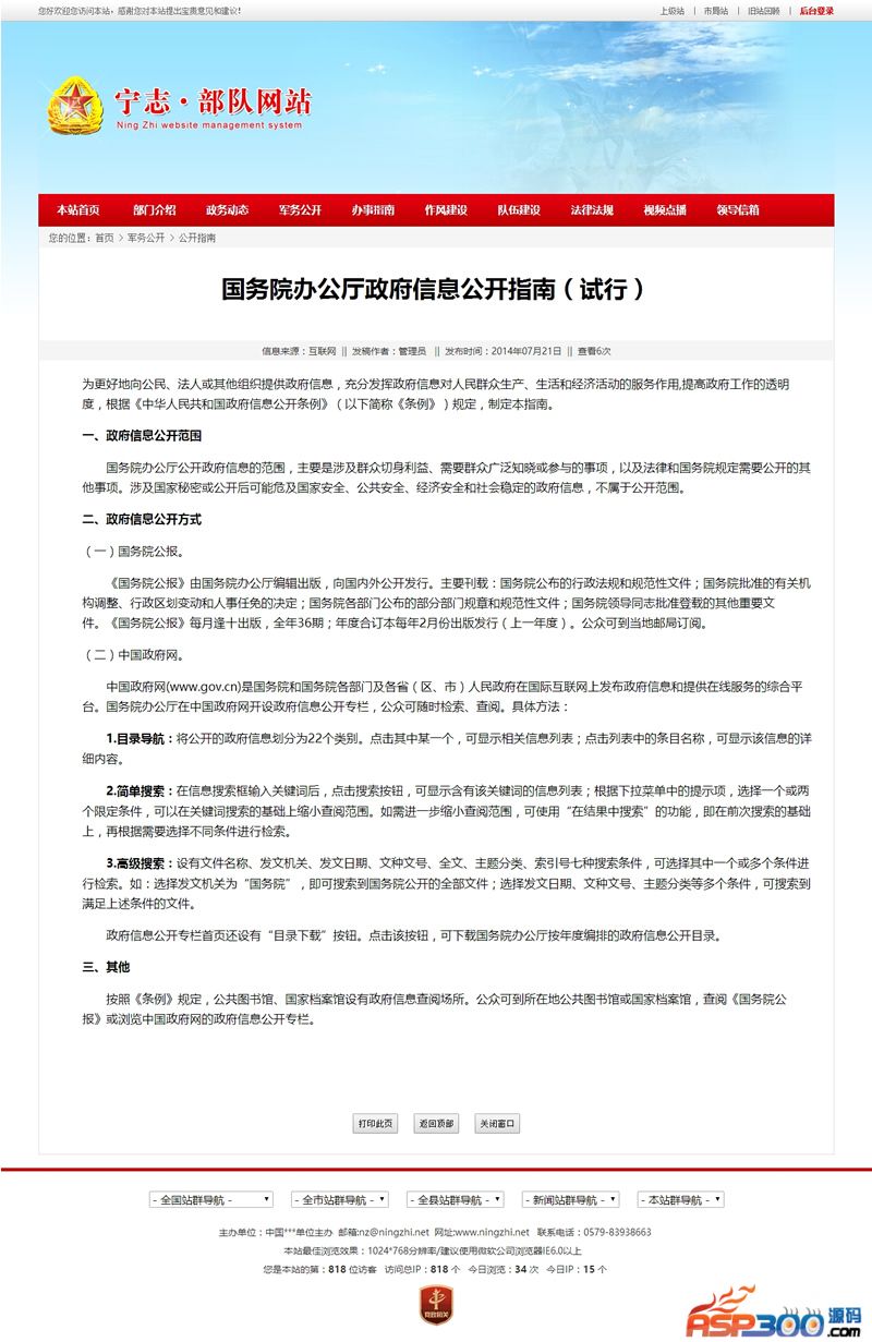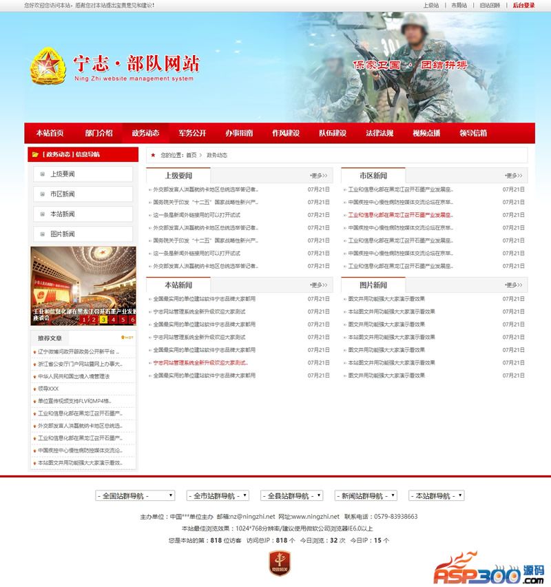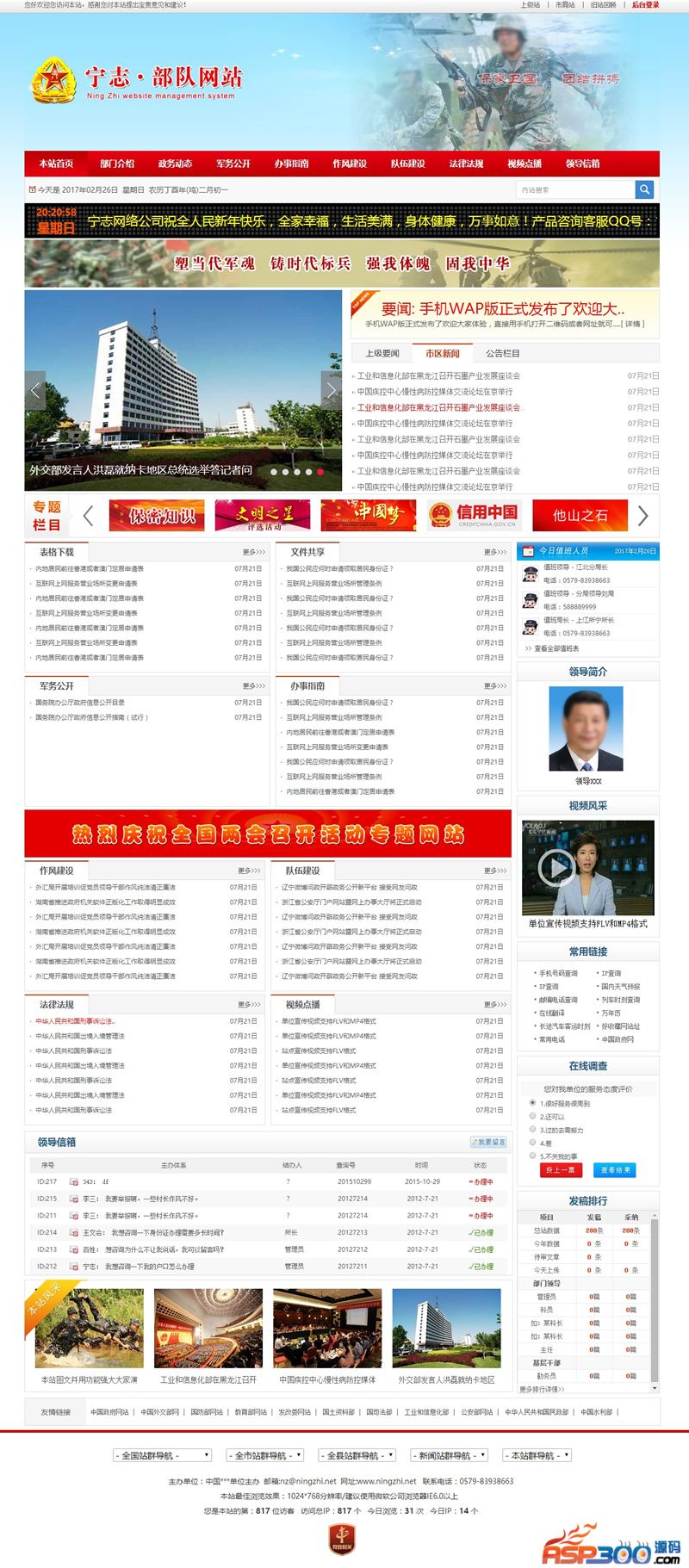 宁志部队网站管理系统是一套专为军区部队建站首选的信息网站管理系统,大红色风格宽频页面十分大方。宁志网站管理系统是国内知名建站软件,它由技术人员开发好了的一种现成建站软件,主要为全国各地方部队军区、自助建站提供方便。网站系统无复杂的安装设置要求,适合广大工作人员使用。特点:安全、稳定、美观、实用、易操作……可设管理员权限分配。