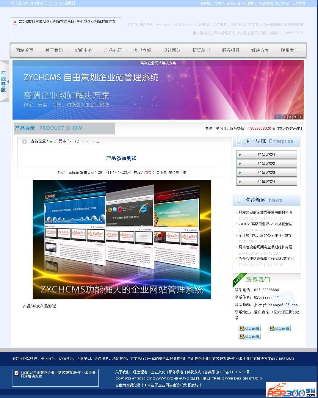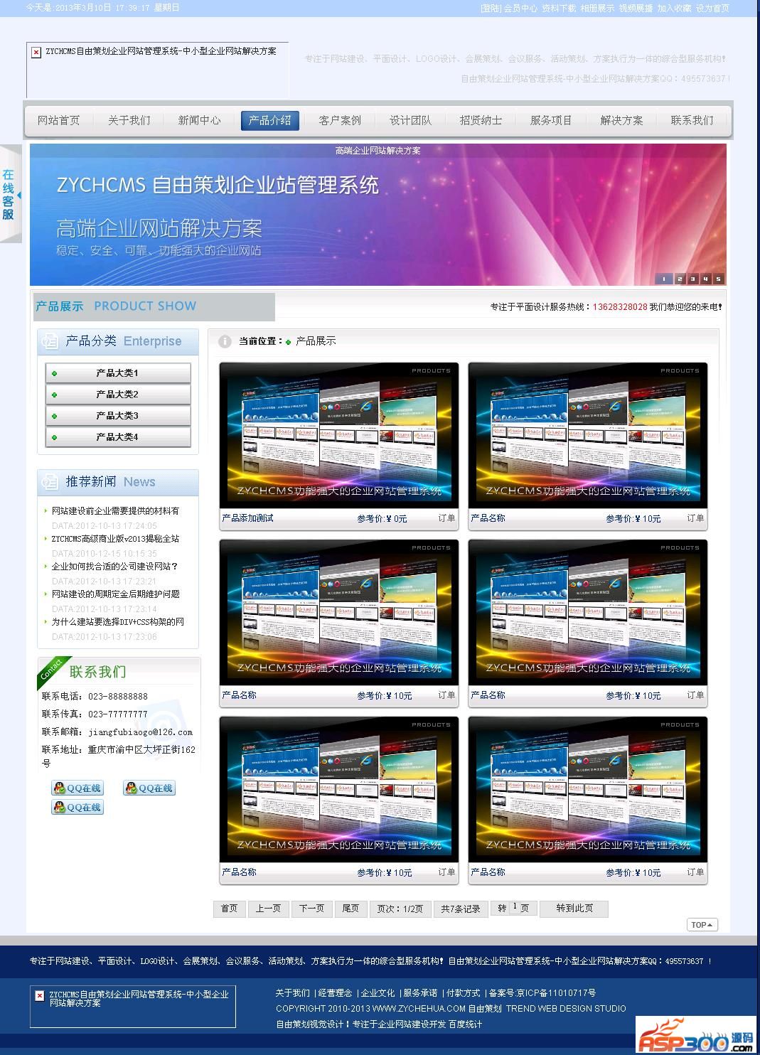 产品管理:产品共有二级分类。产品略缩图、产品价格等。支持在线购买。产品推荐等。
