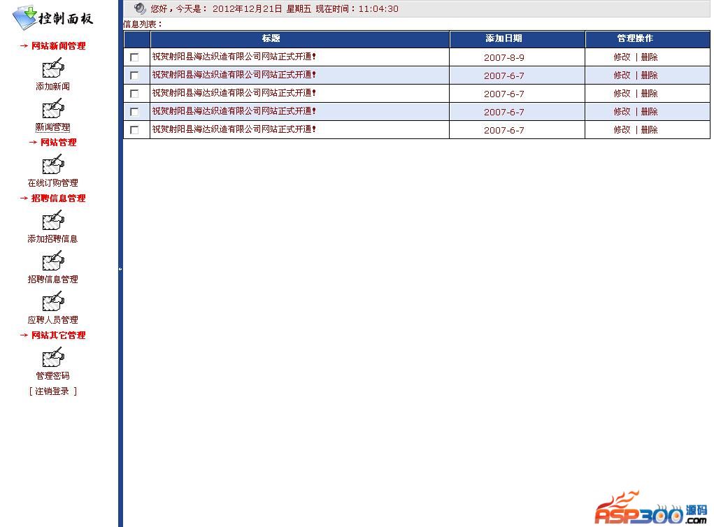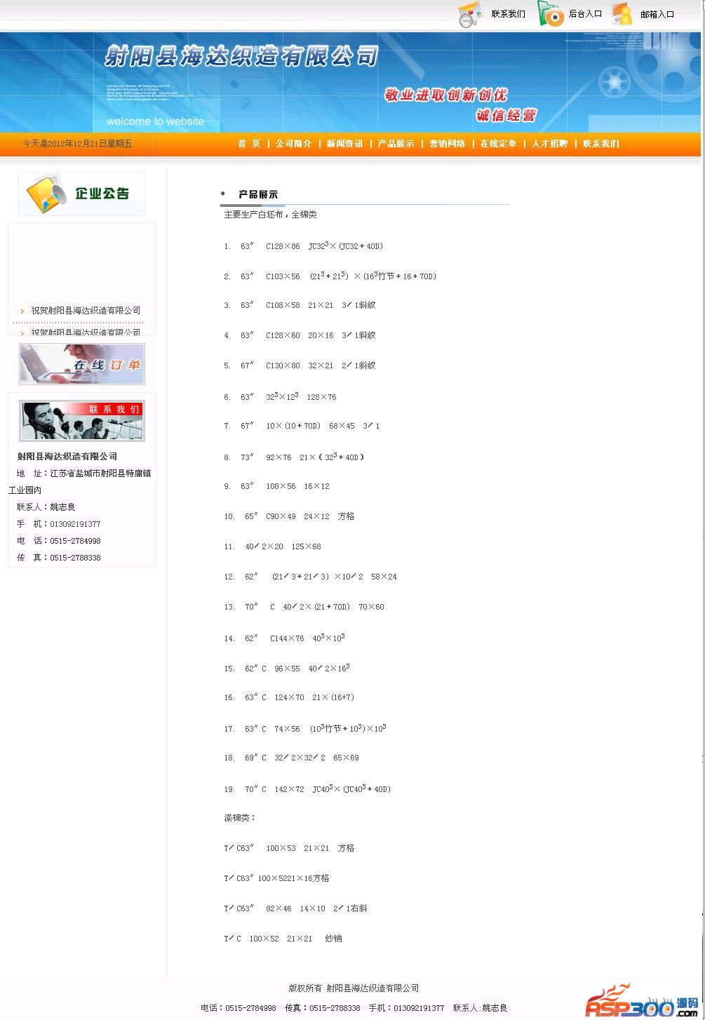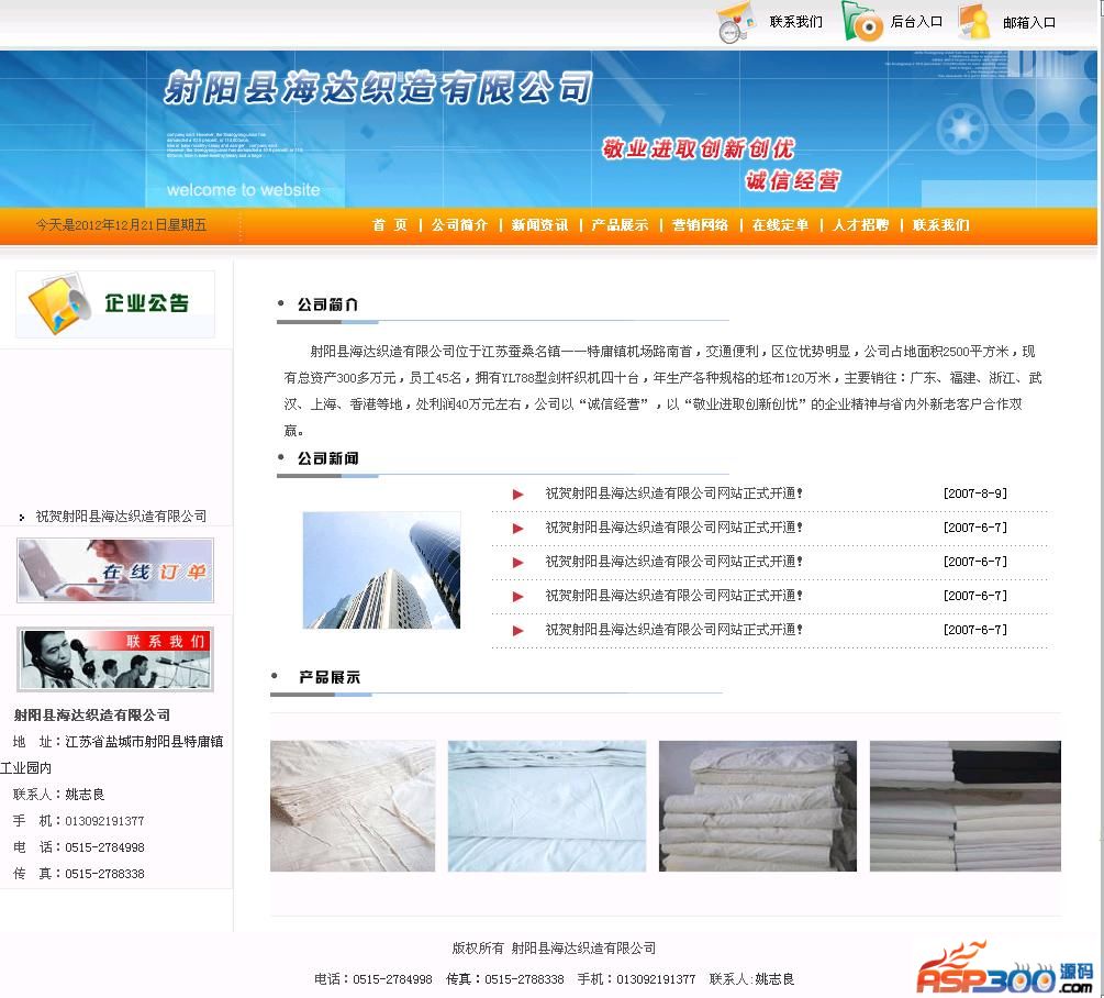 海达织造有限公司网站源码,后台可添加新闻,管理客户订单信息,发布企业招聘信息等。