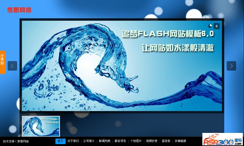 追梦flash网站模板6.0是梦想网络第6款模板,从制作起就汇集了前几款模板的优点,无论是图片自动处理,还是影音播放,都汇集一身,6.0模板的款式可以用清澈来形容,半透明的界面效果加上更多的图片展示,让网站更吸引用户,经过处理的全新加载模式极大提高网站后台管理效率,追梦6.0,让网站更加绚丽 www.53dream.com