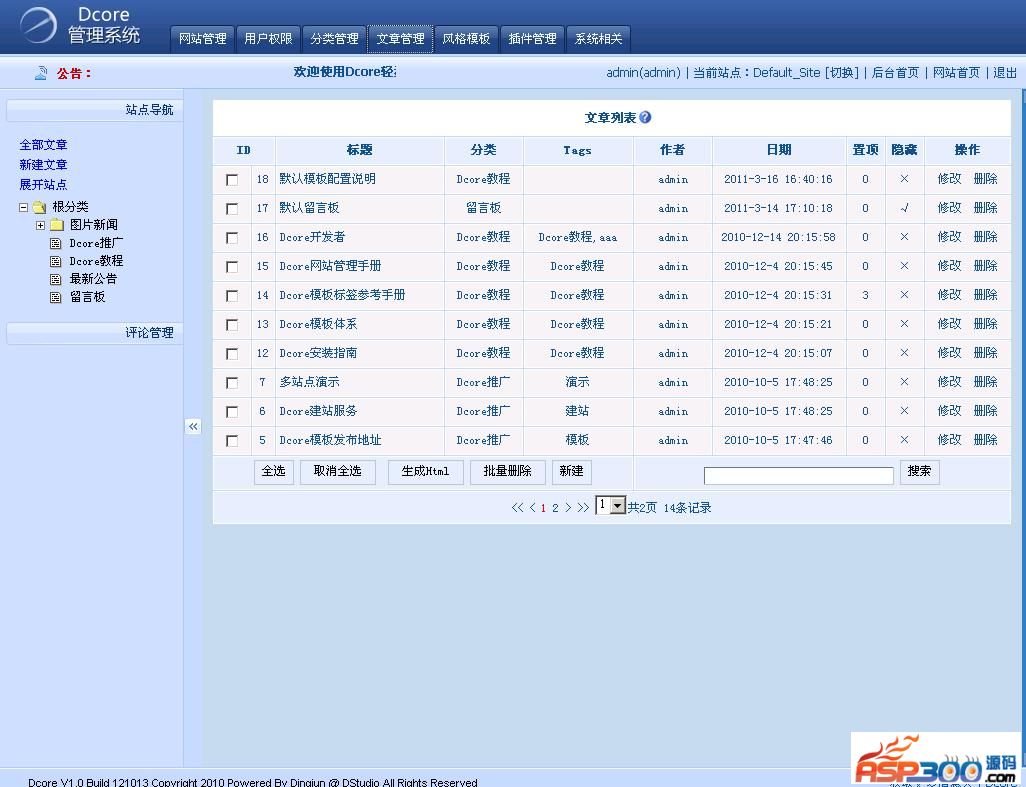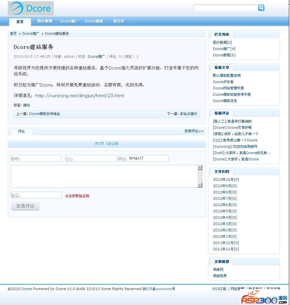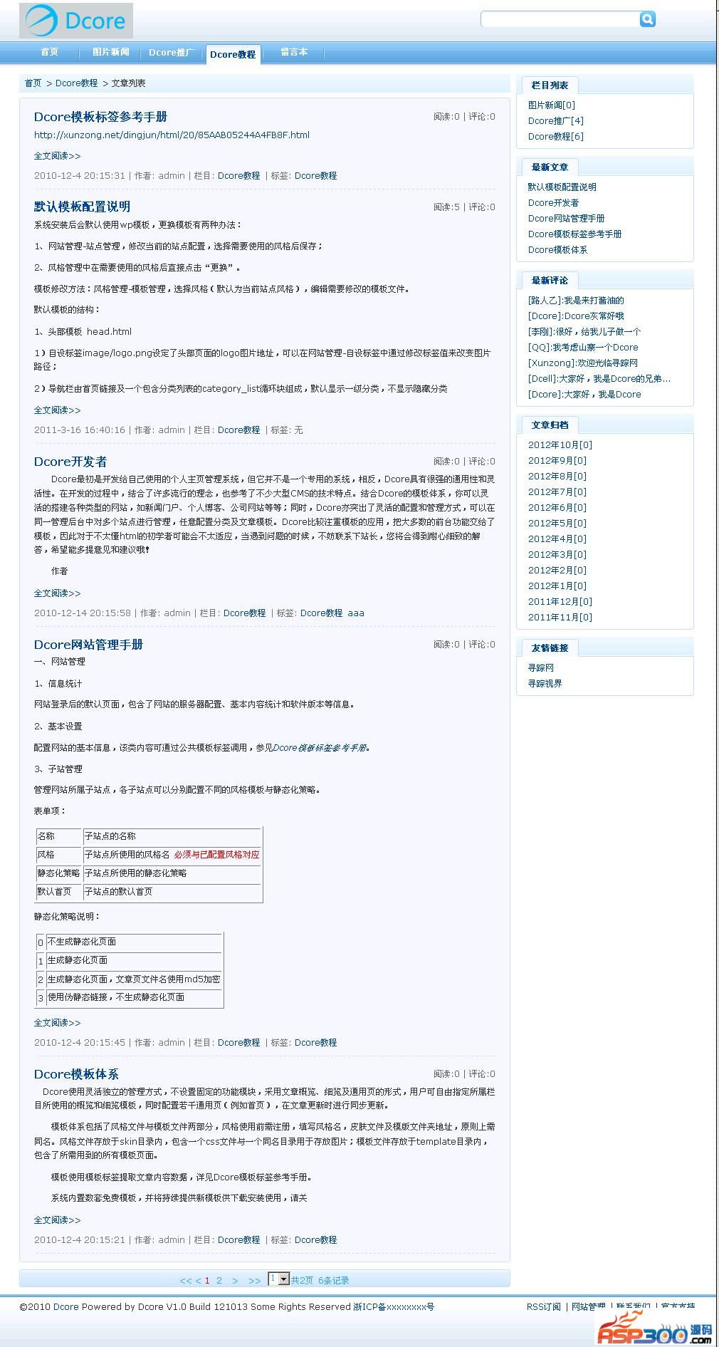 Dcore是一款轻便灵活、简单易用轻型CMS系统,非常适合用于建立个人博客或企业展示站点。Dcore特性:基于ASP+Acess技术,体积小巧、安装简便。简单易用的管理后台,轻松管理您的网站。灵活的栏目结构,可自由定制栏目风格模板。支持建立多个子站点,同一后台自由切换。丰富的模板标签系统和详细的说明文档。同步生成静态页面,支持多种静态化策略。10月13日更新: 1、增加自定义字段选择所属分类功能,未选择的分类中不再显示该字段; 2、增加自定义字段配置功能,可配置字段的表单形式,目前支持文本框和下拉菜单; 3、增加模板yellow,附带一个瀑布流模板页; 4、wp模板和51fz模板增加导航条当前栏目高亮功能;升级说明: 1、备份源代码,备份config.asp配置文件; 2、进入管理后台,在插件管理-SQL执行中执行以下SQL语句: