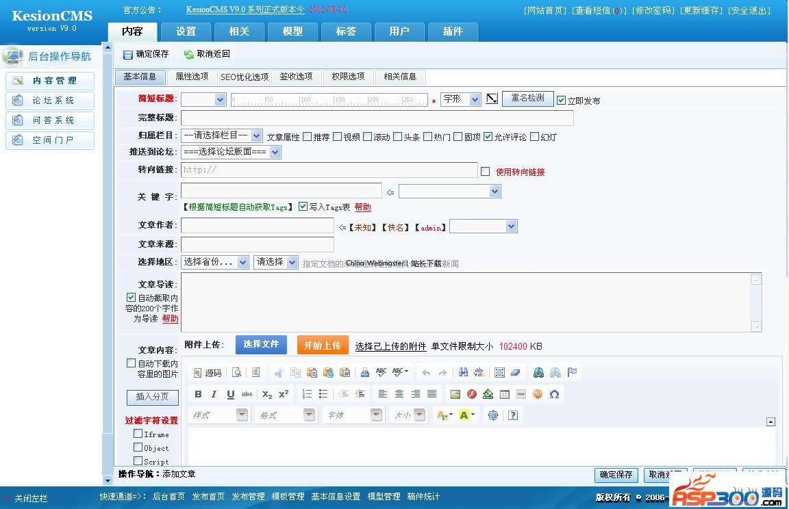 KesionCMS系统由科兴信息技术有限公司独立研发,系统拥有十余个主系统模块,如:文章、图片、下载、问答、论坛、商城、团购、供求、人才、动漫、考试、影视、二手房及上百个子系统模块如:站内调查、友情链接、广告系统、积分、评论等;还可以根据需要自定义模型和表单,字段来拓展网站的功能需求;同时系统具有灵活的产品架构、严密的安全性、系统百分百开放源代码方便功能的扩展,采用ASP+ACCESS/MSSQL数据库架构,适合于各行各类的网站应用平台,是您身边必不可少的“万能建站管理系统。