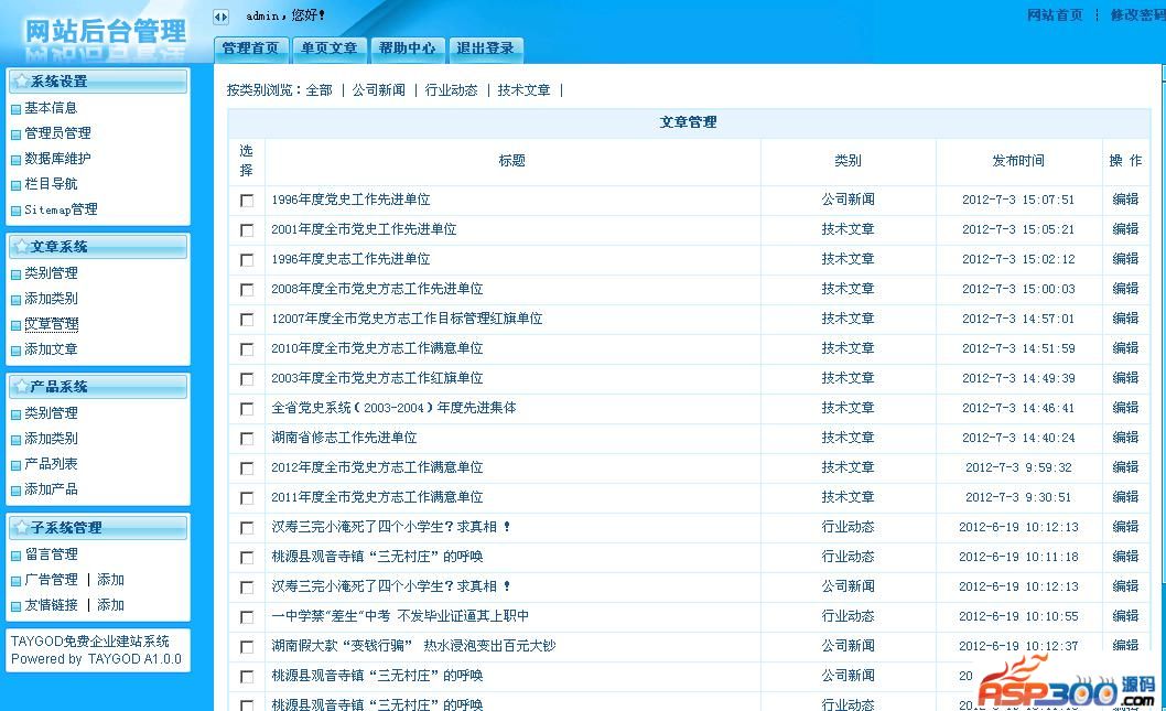 TAYGOD免费企业建站系统ASP版是一款基于asp+access的免费开源建站系统。整套系统的设计构造,完全考虑中小企业类网站的功能要求,网站后台功能强大,管理简捷,支持模板机制,能够快速建立您的企业网站。