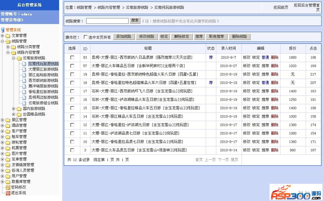 3、后台包括:文章管理、线路管理、景区管理、酒店管理、客户管理、租车管理、机票管理、图片管理、订单管理等。各块下面又划分得很细,如线路管理下面有线路分类管理、内容管理等。网站所有内容后台直接操作。