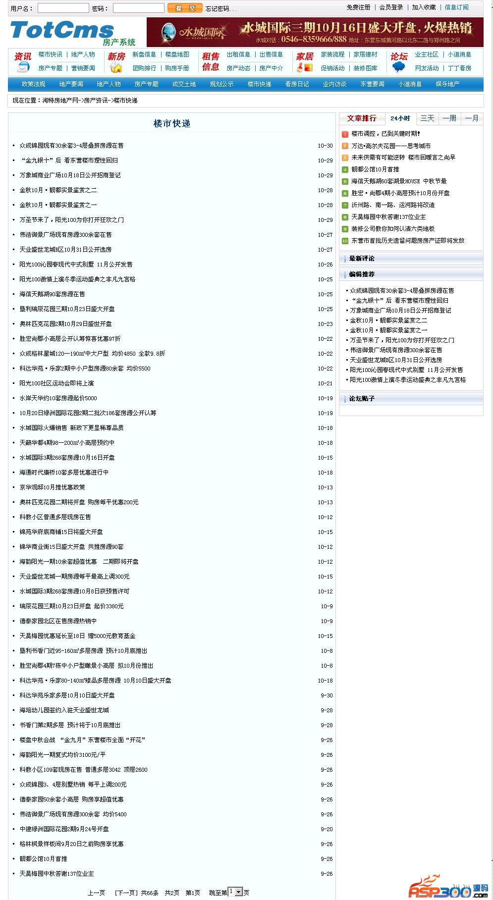 8、房产资讯管理: 使用CMS文章管理发布,可以根据需要添加任意数量个栏目分类,目前已提供的栏目有:购房手册政策法规地产要闻地产人物房产专题房产视频成交土地规划公示市场报告营销要闻楼市快递看房日记二手房新闻