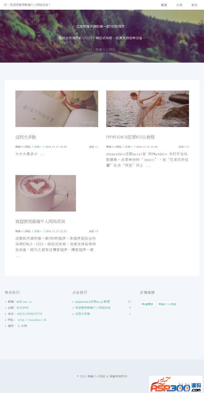 这是熊海开源的第一款PHP的程序,本程序前后台均采用HTML5、CSS3,响应式布局,完美支持各种浏览设 备,因为之前写过博客程序,博客程序一直太过于注重功能,从而忽视了内容的重要性,所以这款个人 网站程序做出了一些改变,主要突出内容,从而削减一些功能,以简洁轻量为主。
