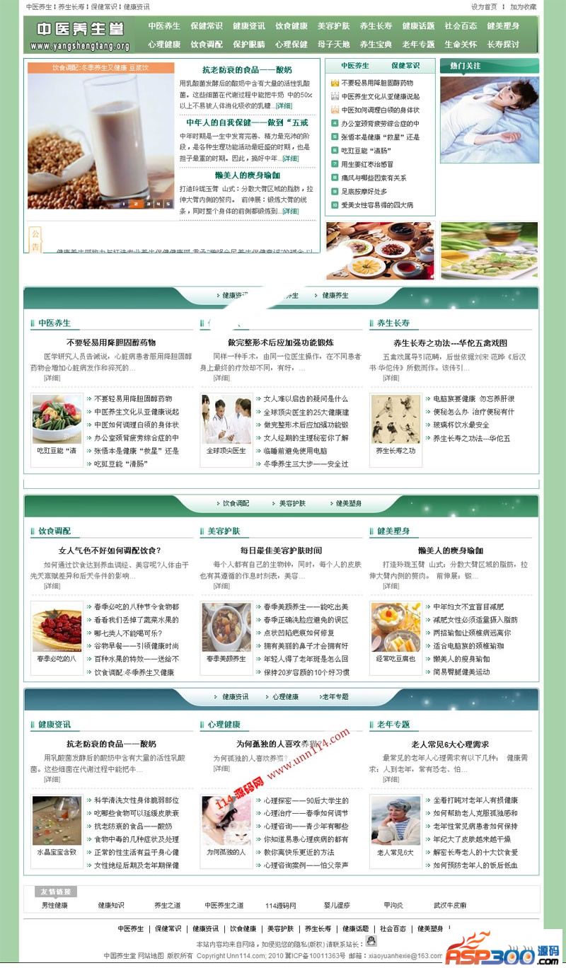 整站栏目:中医养生、保健常识、健康资讯、饮食健康、美容护肤、养生长寿、健康话题、社会百态、健美塑身、心理健康、饮食调配、保护眼睛、心理保健、母子天地、养生宝典、老年专题、生命关怀、长寿探讨 。