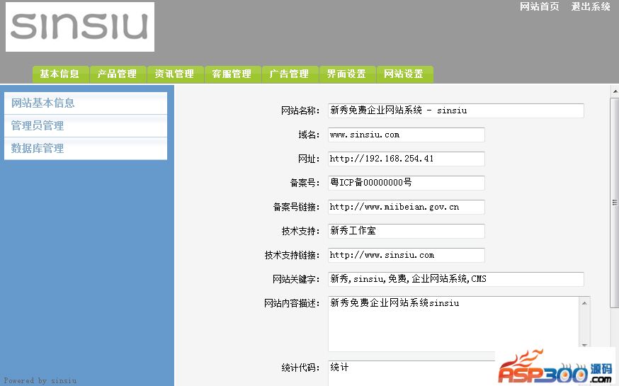 1.基本设置:基本信息,联系方式,网站设置,导航管理,模块启闭,安全设置,数据库管理,其它设置;