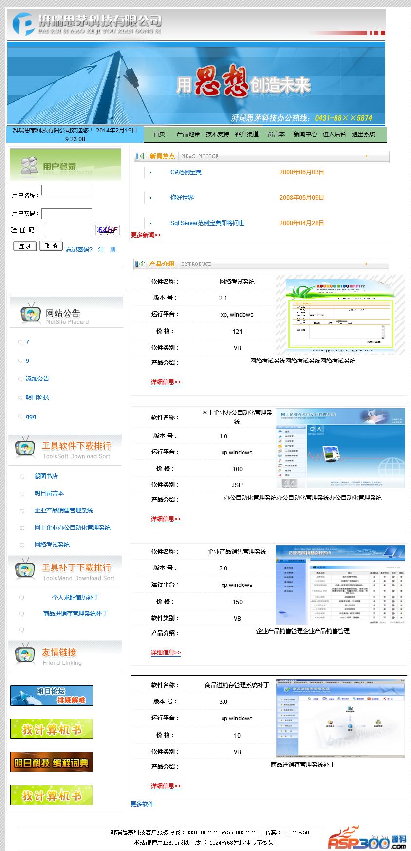 前台展示区主要实现:首页、网站公告、新闻热点、工具软件下载排行、工具补丁下载排行、用户登录、用户注册、更改口令、找回密码、退出系统等到功能模块信息的显示;