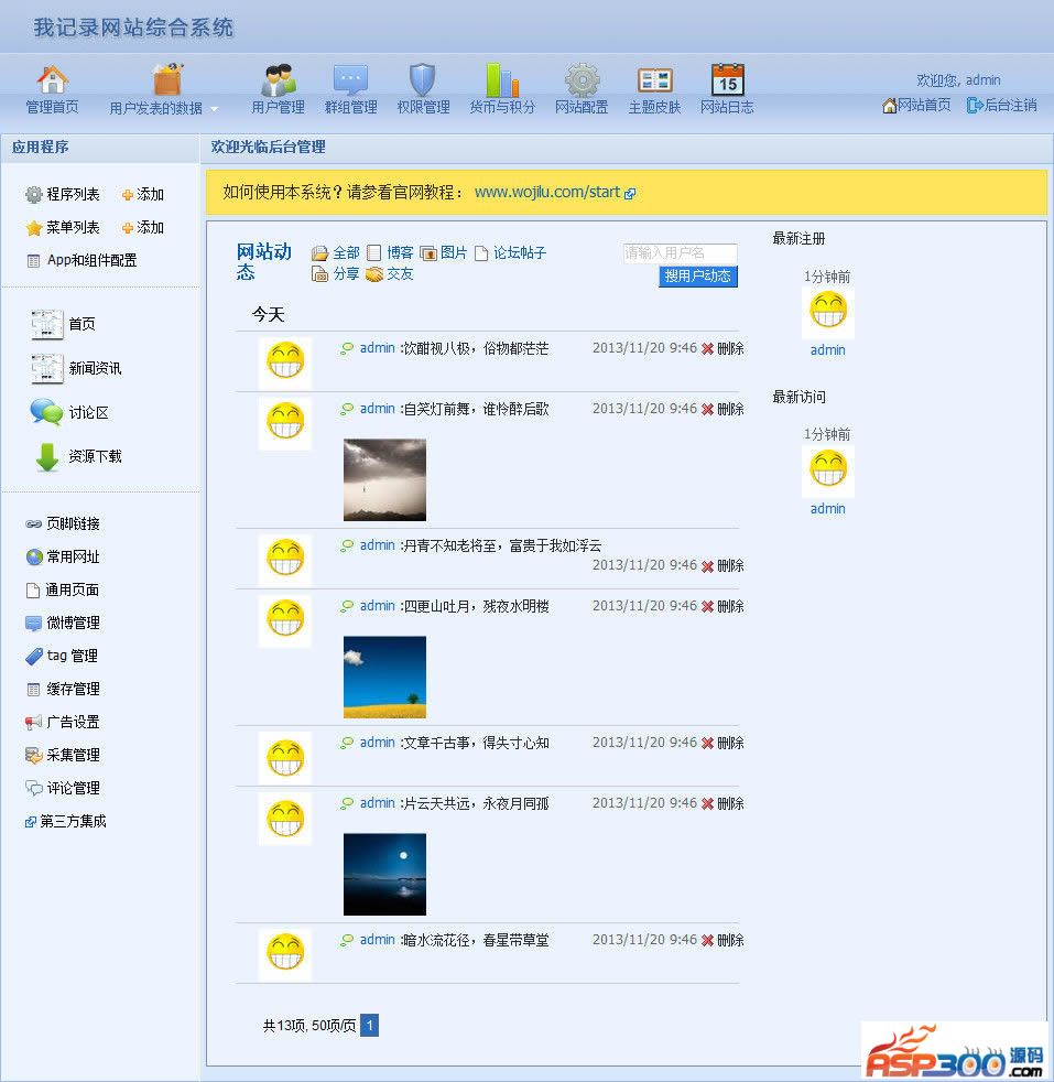 我记录网站综合系统集成了“SNS/门户/CMS/论坛/博客/相册/微博/群组/瀑布流/下载/WIKI”等应用程序的互联网产品,为互联网创业提供一站式解决方案。