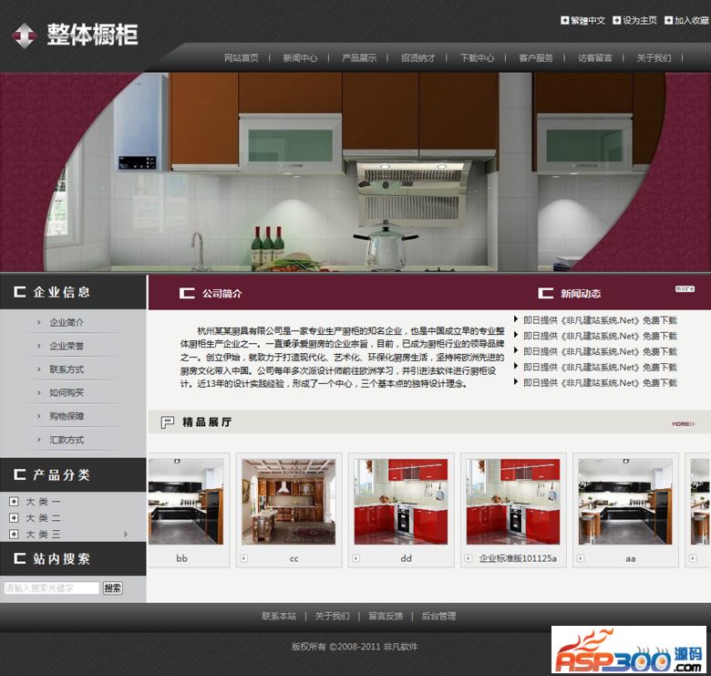 漂亮的厨柜公司网站。深色配以藕荷色的站头衬托出稳重大方的布局,室内整体设计布局合理。橱柜,油烟机,厨宝的一一陈列显示出公司产品的全面多元化,油烟机的上方橱柜的凹槽设计更显示出产品设计的人性化。全站分类简单明了,精品展厅的展示更是省去您构思设计的烦恼。