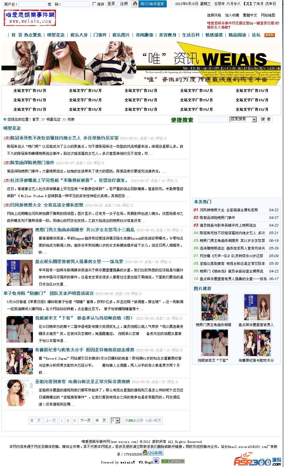娱乐资讯新闻文章管理系统是老Y系统改版而来,本系统采用Asp+Access开发,适应中小新闻文章型网站及个人网站需求,整个网站采用Div+Css布局,IE6、IE7、IE8、Firefox、Chrome下测试无误。