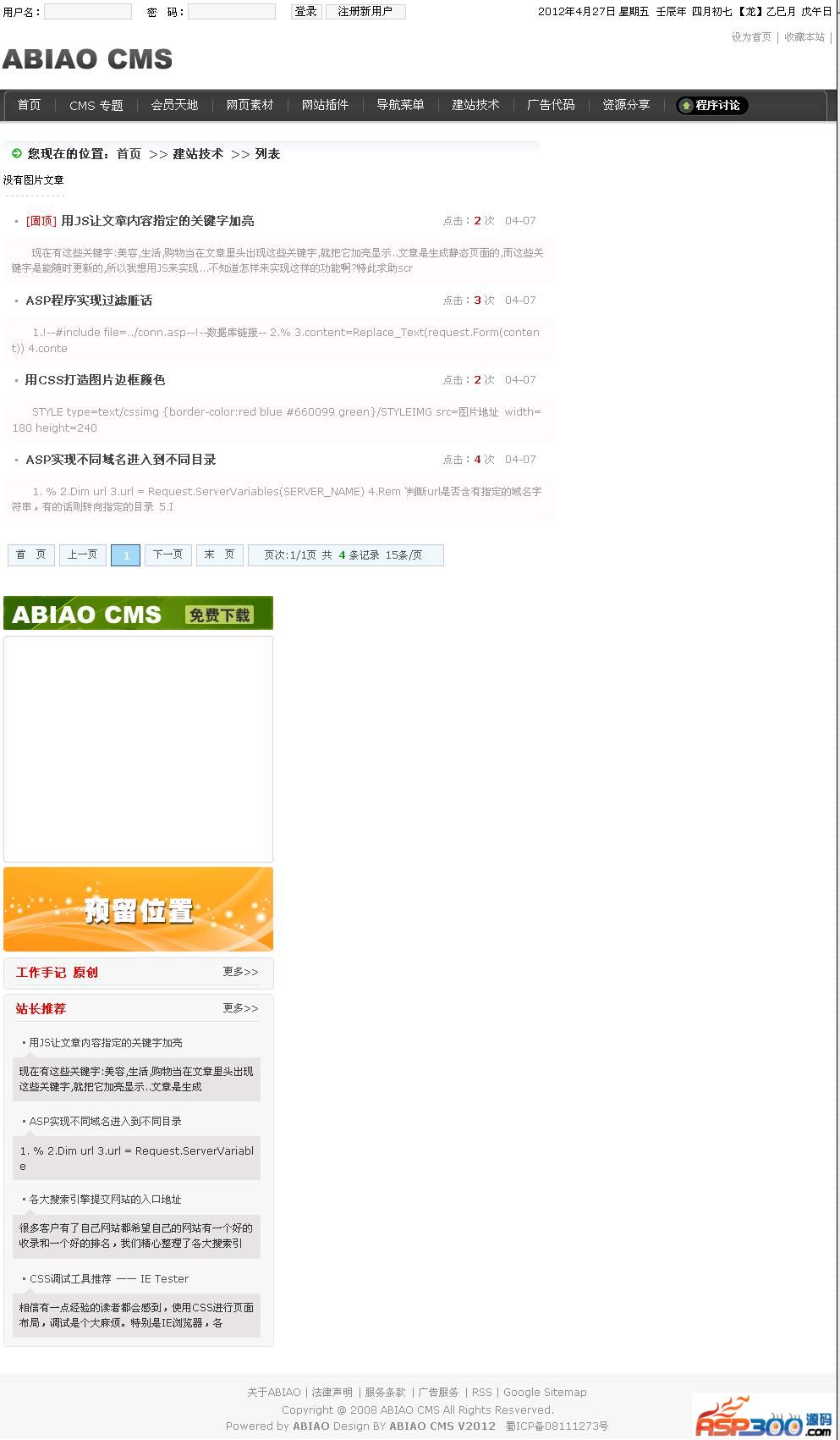 ABIAO CMS V2012 Beta (阿标文章管理系统)采用Asp+Access开发,适应中小新闻文章型网站及个人网站需求,整个网站采用Div+Css布局,IE6、IE7、Firefox下测试无误.