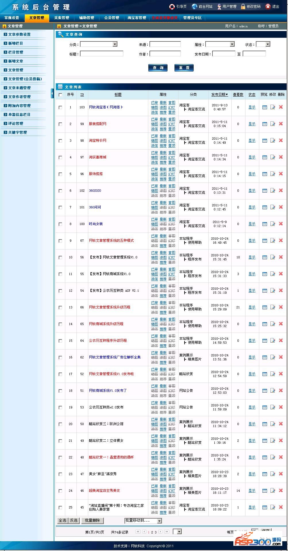3、可在文章管理列表中直接设置推荐、置顶、幻灯、滚动图片、缩略图、滚动信息等属性,减少操作;