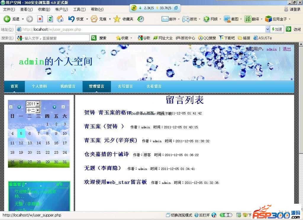 web star留言板是一个简单的php留言板,内部设有一个"个人空间",以便给用户查看管理自己的个人留言等信息。管理员(超级用户)的默认用户名admin,密码为password,可以在conn/config.php中更改,但前提是更改的用户名必须是已注册的。由于留言板不是太复杂,所以除了"个人空间"外,就没有写其他管理的后台,管理员登陆后,可以直接在留言展示页面管理其他用户的留言,当然,作为留言来说,管理员多的权限就是"删除"其留言。系统中用户共分为19个等级,每10个积分会升一级。等级从高到低依次为: