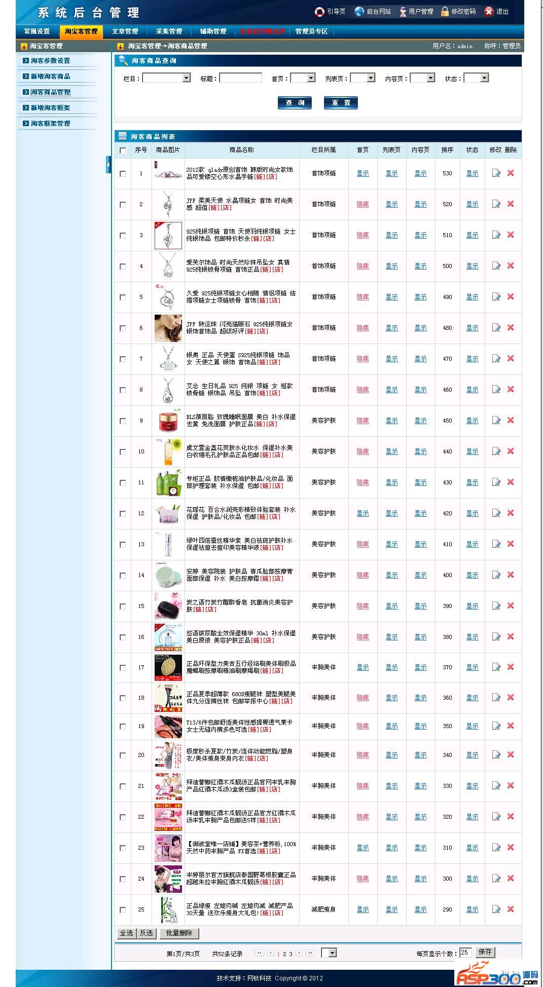在网钛文章管理系统OTCMS基础上,保留文章功能,去掉其他非文章功能,并着重加入淘宝客元素和淘宝客功能。 当前V1.0版本主打淘宝客单品功能,可以随意设置淘宝客商品在首页、列表页、内容页显示,同时也可以限制只在某个栏目里显示。前台显示的淘宝客商品的超连接和图片路径,均采用base64加密,让搜索引擎判断不出是来至淘宝的数据,同时加入图片延时加载技术,减轻淘宝客图片对网站显示速度的影响。后期会根据大家使用反馈,来不断调整和优化该程序~网钛淘客v1.3 build 20120918更新内容:1.单品推广模式新增最大显示数量限制