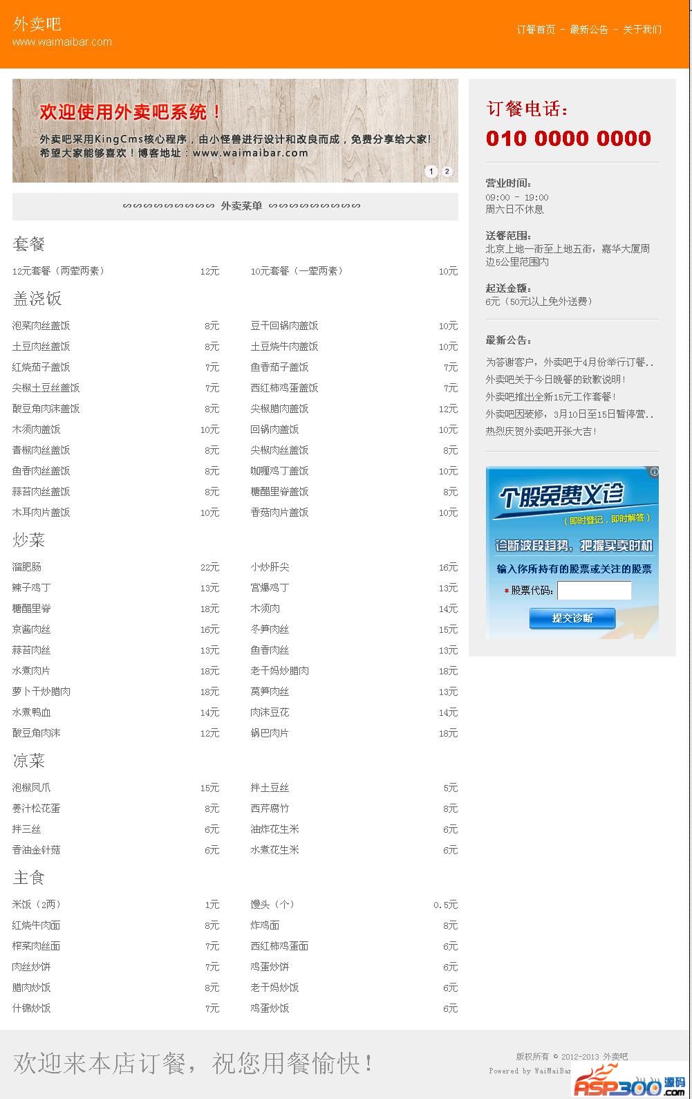 一、外卖吧采用PHP+mysql,核心程序使用了kingcms PHP版,重新设计了模板界面,增加了一些操作功能,方便外卖同行可以很好的展示宣传自己的外卖产品。本套源码的模板可以随意共享传播,程序版权仍归Kingcms所有。