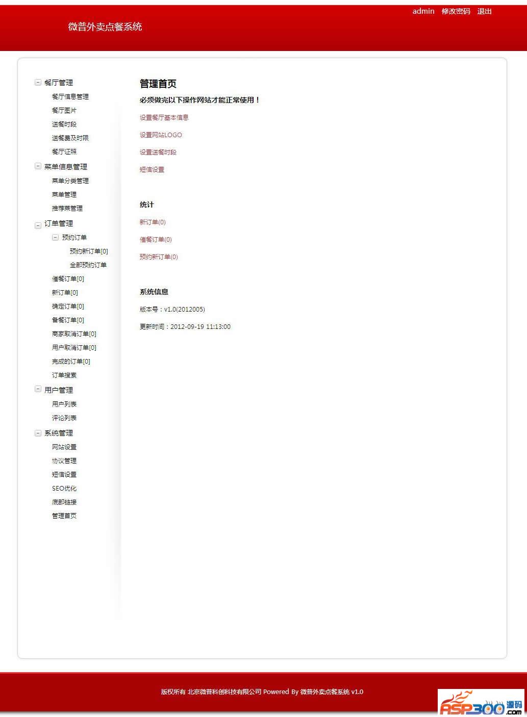 微普外面点餐系统v3.0 更新内容:ADD1、增加无线打印功能2、增加手机版3、增加对用户群发短信功能,搜索功能4、增加批量处理订单功能,如批量确认、取消、删除等功能5、增加统计分析功能,分析订单,消费等统计功能6、底部链接增加直接外链形式7、文字版菜单模板增加了图片8、新增设置在线QQ客服9、后台首页增加快速搜索订单和用户功能10、增加批量删除菜品功能11、自定义网站ICON功能12、增加积分和经验值