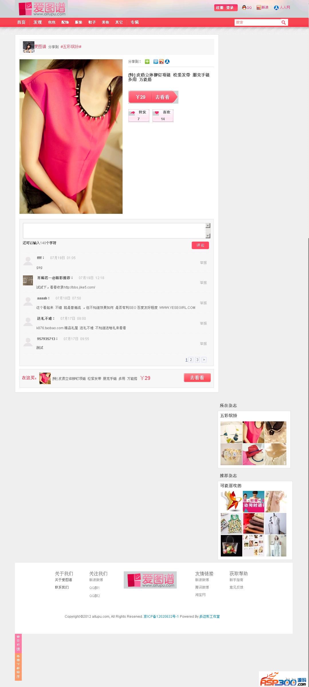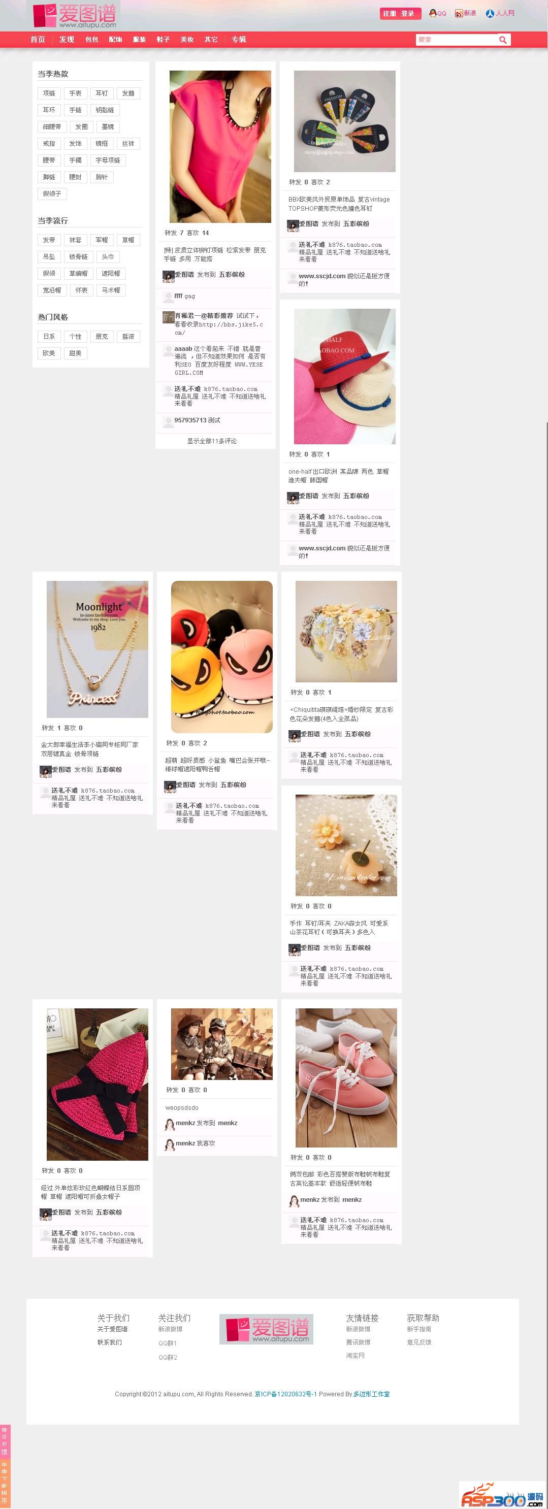 爱图谱是一款社会化视觉购物分享系统,基于PHP,Mysql开发,MVC架构,并承诺将永久免费开源!产品特点流行时尚的瀑布流设计,新颖的页面展示形式轻量级社交关系,支持主要社交操作整合了多个社交账号,支持多账号绑定支持批量发布商品,无须手工抓取页面即可完成淘宝客商品导入整合UCenter,支持Discuz,ECShop等系统统一登录基于PHP+Mysql开发,产品免费、开源,方便站长二次开发与定制主要功能流行瀑布流布局时尚瀑布流布局带来绝佳的视觉冲击力,配合页面无限加载,吸引用户眼球,提高用户粘度社交账号整合内置新浪微博、腾讯微博、人人网、淘宝账号绑定,支持直接登录到站点集成分享插件,支持一键将内容分享至社交网站,带来10倍流量轻量级社交关系抽取社交网站主要社交关系,去除了繁杂的功能,平衡了简洁设计和功能体验支持用户分享、好友关注,同时支持专辑管理分享等功能批量发布淘宝客商品内置淘宝客API,后台支持关键词、分类实时查询淘宝客推广商品,支持一键批量抓取,分享至前台。MVC架构设计基于PHP+Mysql开发,采用国际流行CodeIgniter框架,页面与程序逻辑分离,二次开发与模版定制便捷。UCenter账号绑定支持内置UCenter账号支持,通过简单配置即可绑定Discuz,ECShop等常见网站应用程序。