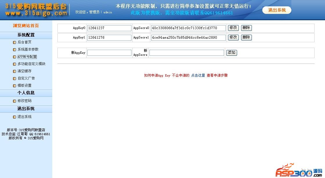 【安装方法】1:下载315爱购网联盟店源码安装包并解压缩2:上传至网站根目录,或子目录3:登陆后台http://域名/admin/ 并修改配置站点信息 初始账号:admin 密码:admin4:logo默认路径..img/logo.gif 用您自己的LOGO覆盖即可!【更新内容】修复 还有个别商品调用不到推广地址。修复 漏洞:API出错率问题、详细页取不到推广连接问题,多API自动切换修复 红色主题单类别模板,搜索框里的词IE错位修复 default模板只能显示5个类别优化 首页图片不能直接连接淘宝优化 店铺页图片不能连接淘宝优化 图片本地化的一个BUG,增加兼容性。优化 商城有关模板,都修改加宽了头部右上角广告位置。优化 再次加强调用成功率,大部分人都将不再会受到调用率过低提示。优化 修改密码的提示语更改优化 产品详情页面在设置关键词替换的时候容易被替换成空优化 产品关键词替换,只替换一次优化 商城模板首页左右分别掉不同的词语优化 处理所有页面的脚本错误。优化 没填搜索内容搜索,会出现找不到页面优化 wordpress整合乱码问题,以及标签和类别混淆问题。优化 onepage模板,图片不能直接到淘宝,后台无效优化 能搜出来,不能跳转淘宝, gotourl.php页面无参数反复跳转。增加 加入默认地址栏ICO图标增加 整合文章可以指定类别增加 PID过滤空格,防止多填了个空格导致的PID失效丢单。增加 S8功能,已下架商品,可自定义要跳转地址增加 超级嵌入功能。完美嵌入淘宝推广频道。进后台-配置中心-自定义伪原创栏目内设置。