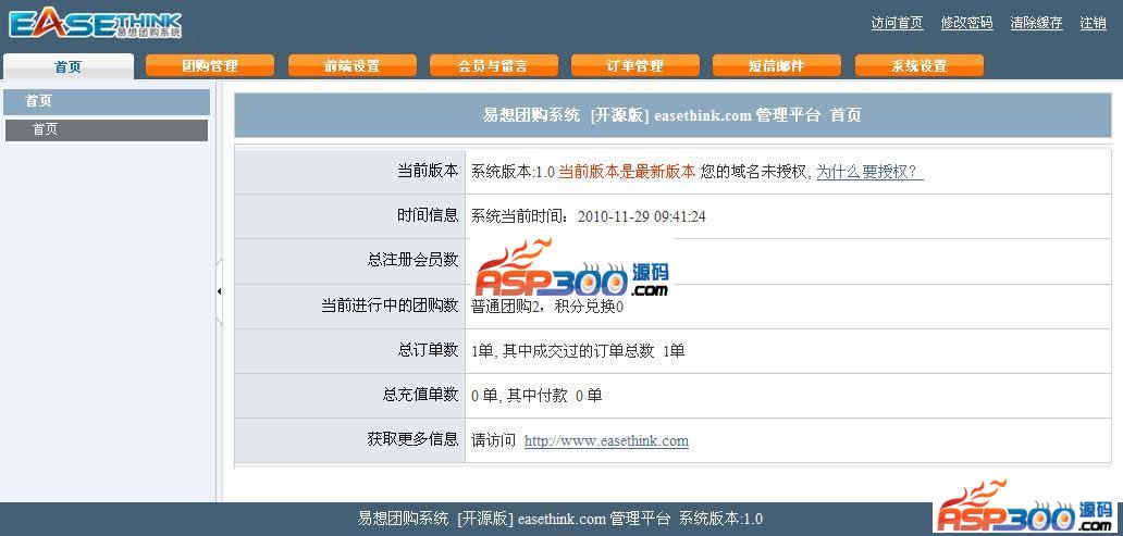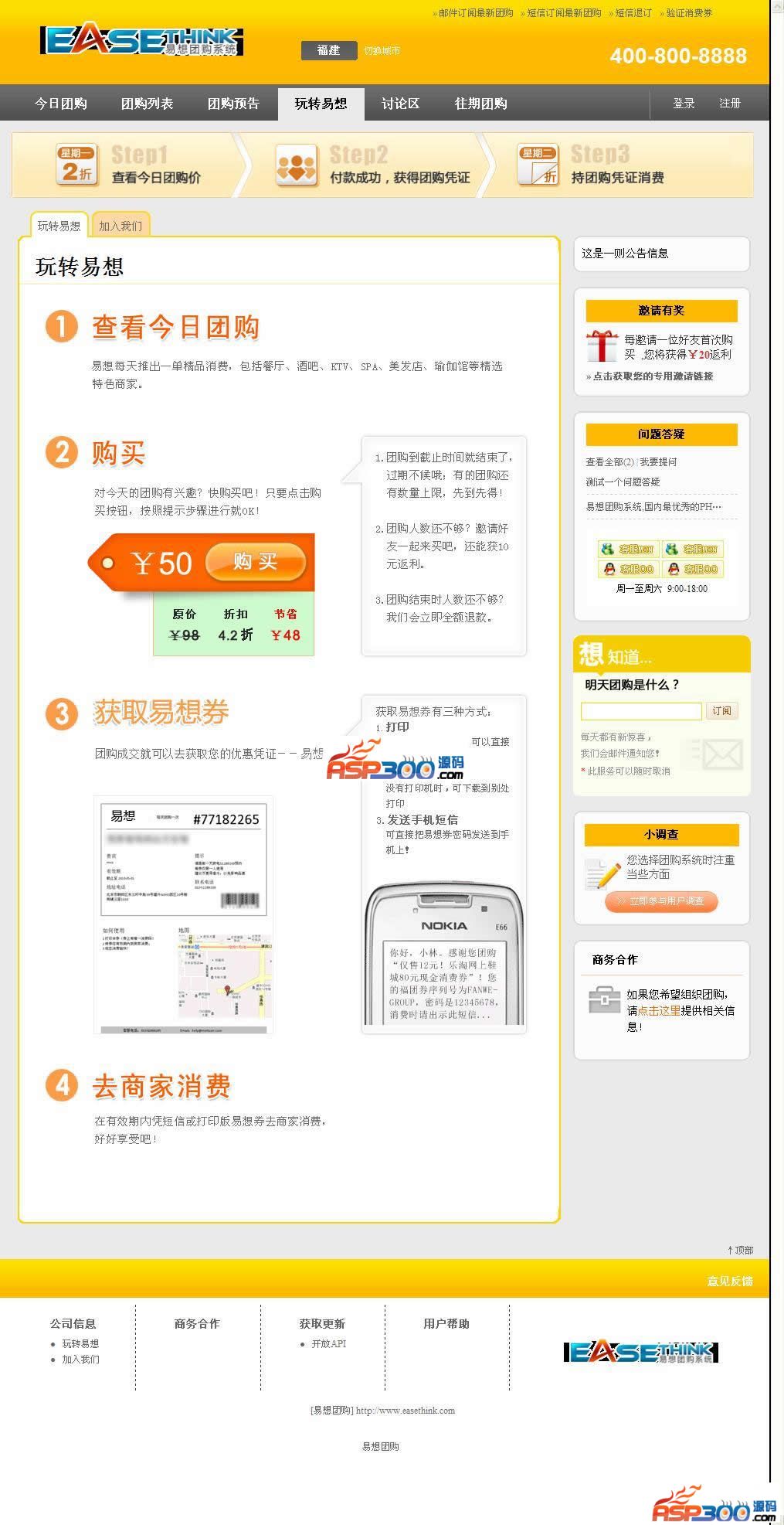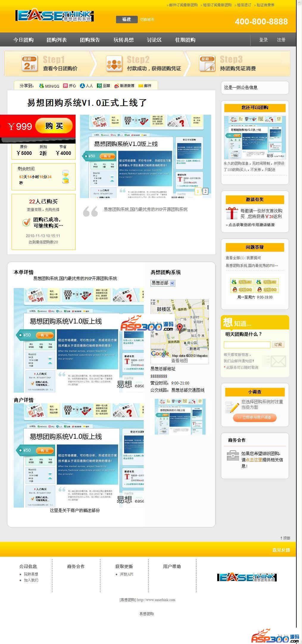 易想团购管理系统是一套定位中高端市场的团购内容管理系统,能够以最低的成本,最少的人力投入在最短的时间架设一个功能齐全、性能优异、规模庞大并易于维护的网站平台。1. 安装环境需求IIS/Apache + PHP5 + MySQL4/52. 初次安装程序,将程序上传至web服务器,根据安装界面的示完成系统的安装。3. 安装成功后可删除 install 目录, 后台管理的文件为 admin.php, 如果担心后台地址的泄漏,可直接将该文件改名,同时访问改名后的文件4. 后台默认管理员的帐户为: admin 密码: admin5. 前台的演示用户帐户为: easethink 密码: easethink6. 如要使用伪静态,可在后台开启伪静态功能,需要服务器对rewriter的支持易想团购系统v1.4 开源版更新1. 修正服务器不支持json时的json兼容函数2. 修正团购预告列表,时间显示为团购开始时间3. 修改购买时可先添加购物车,结算时登录4. 修正分享到XXX IE6乱码的问题5. 支付响应以及队列发送的BUG该更新包包含所有版本升级到1.4的升级脚本,以及修正1.0-1.4所出现的所有已知BUG