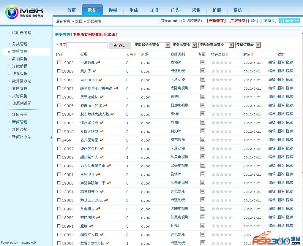 带两个单电影更新插件,手动和自动更新,支持站点:奇热/神奇影院/第一放映室/爽TV/快播搜/Tom365/qq500/4090/3G免费影院/看撒动画/电影天堂/PPVOD资源站/PIPI资源站/窝窝)