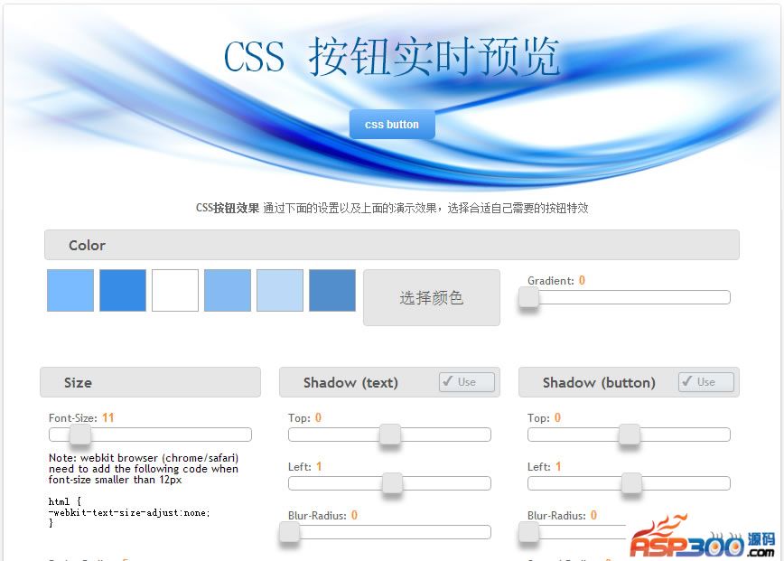 本按钮是从国外的CSS Button Generator 整理下来的。如果有需要的朋友可以放到自己的站点下,在需要的时候直接打开,复制需要的CSS样式以及调用CSS就可以了。