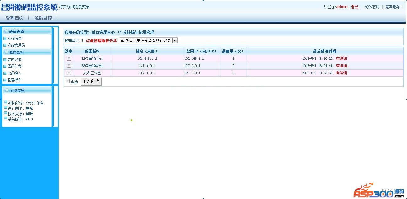 2、集成后你源码发布出去有人使用后你就能在“监控记录”里面看到使用情况,如:使用域名、使用的服务器IP、最后使用的用户IP、后台地址、后台登陆用户名和密码;