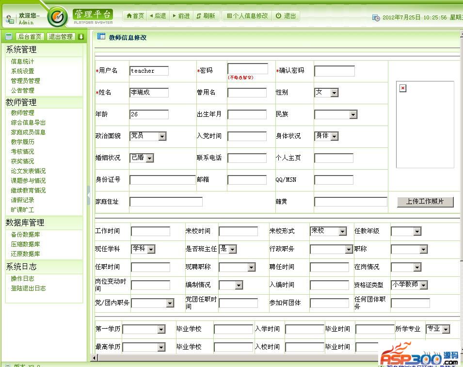 新翔教师信息综合管理系统V3.0,采用asp+access开发,B/S架构,只需要安装在一台电脑上,也可以安装在网站服务器上,其它联网电脑可以用浏览器访问。
