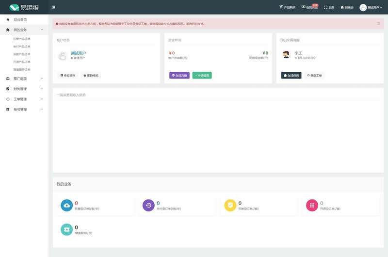 拥有会员注册、充值、自助购买、自动域名授权、发票申请、售后工单、续费管理、客服管理、推广营销、等全套功能。