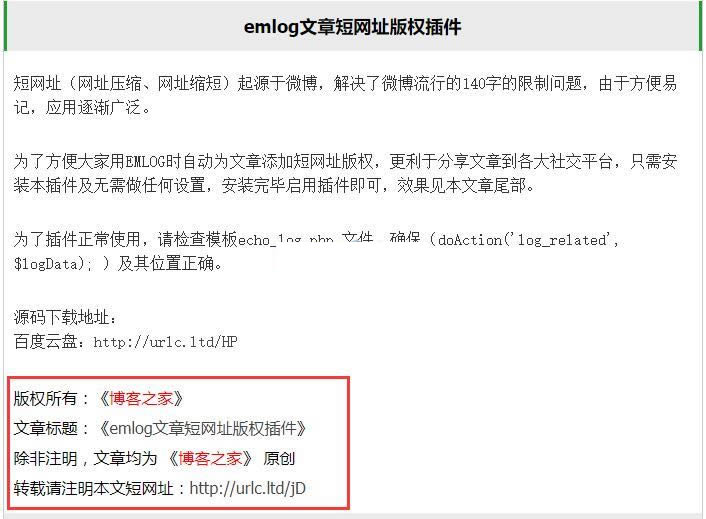 为了方便大家用EMLOG时自动为文章添加短网址版权,更利于分享文章到各大社交平台,只需安装本插件及无需做任何设置,安装完毕启用插件即可。