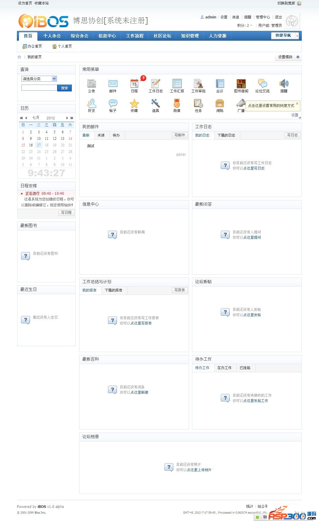 目前OA系统主要是以传统的收发文管理,档案管理为主。有些OA产品整合了很多辅助企业管理和办公的功能如: BBS、公告板、名片夹、文档管理、人事的管理、资产的管理、日程安排、报告管理、图书管理、车辆管理、企业大事记等功能。一些中、大型企业除了办公自动化系统之外,还专门定制开发了财务、库存、生产、销售、人力等管理系统。开发和销售这种产品的企业很多(金蝶、用友、泛微、金和等),目前占据了OA市场的主流。这类产品价格比较高,产品安装、实施、维护的成本及门槛都较高。有没有一种能够让中小企业能够用得起,大型企业也能够满足需要的协同系统(或者模式),将中国企业信息水平提升一个层次?在这里向大家推荐由博思协创发布的一款协同办公平台IBOS。IBOS融入了现代企业管理的思想精髓,在具备传统企业管理软件的功能模块基础上整合了社区、SNS网站的娱乐化元素,其可以运行在虚拟主机、VPS、云主机、独立服务器等任何支持PHP+MYSQL的服务器环境下,让企业使用OA门槛大大降低;将大大促进中国企业协同办公程度的提升。IBOS的特点如下:免费下载,零风险实施● IBOS可随时下载、安装试用,可安装在个人电脑、虚拟主机、VPS、云主机、独立服务器等任何支持PHP+MYSQL的服务器环境。● 实施成功后决定购买商业授权,零风险实施部署。快速安装,部署便捷●IBOS 如同网站程序,上传到支持PHP+MYSQL的WEB环境,即可通过WEB界面快速完成安装配置。●IBOSEXP 能够根据用户计算机配置自动优化服务器环境!只需运行双击鼠标运行安装程序,一切就都已搞定!数据安全,低成本高可用性● 数据存储在企业PC、服务器或网站主机上,不同于SAAS模式。● 正式版将对数据库进行定时备份和云存储两种措施,低成本打造高可用心数据备份机制。简单易用,快速上手● 社交网站风格,会上网就会使用● 采用新技术减少繁杂的操作,优化用户体验。引入了HTML5特性,复杂操作可通过拖拽完成。性能卓越,互联网模式开发● 采用全球认可的最为先进的开放理念——OOP(面向对象)架构,使用PC服务器或虚拟主机即可实现数百人规模应用。● 快速迭代的互联网模式开发协同管理平台,所有用户可参与开发改进产品,关注跟踪我们的研发进展,并针对我们研发的功能予以反馈。随时随地,快乐工作● 支持PC、MAC、IPAD 、IPHONE、ANDROID等设备随时随地使用,抓住时间碎片。● 金币?升级?打怪? 经验!贡献!勋章!同样魅力无限。换种思路,工作原来可以更快乐。