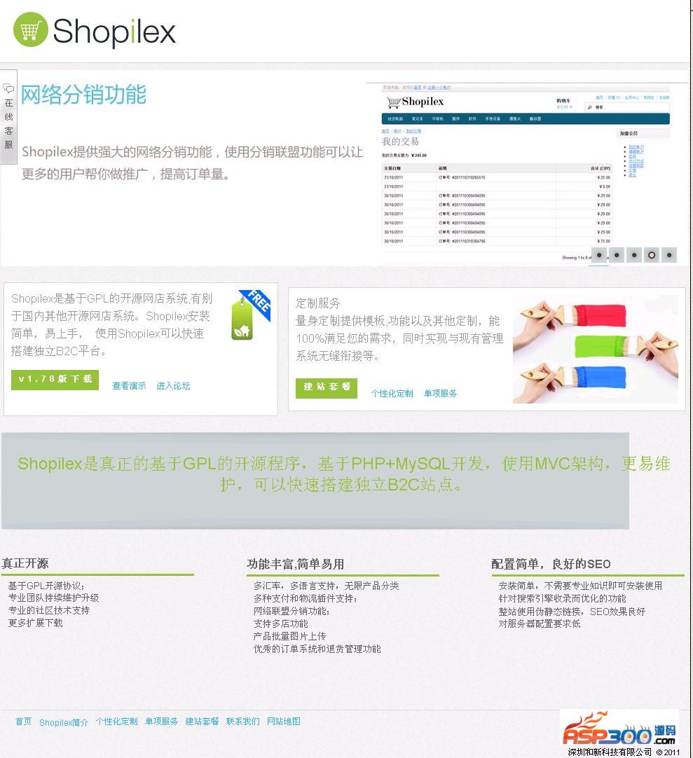 Shopilex是一套基于GPL开源协议的,基于MVC架构的PHP开源电子商务网店系统,是目前中文领域里真正开源免费的网店系统。