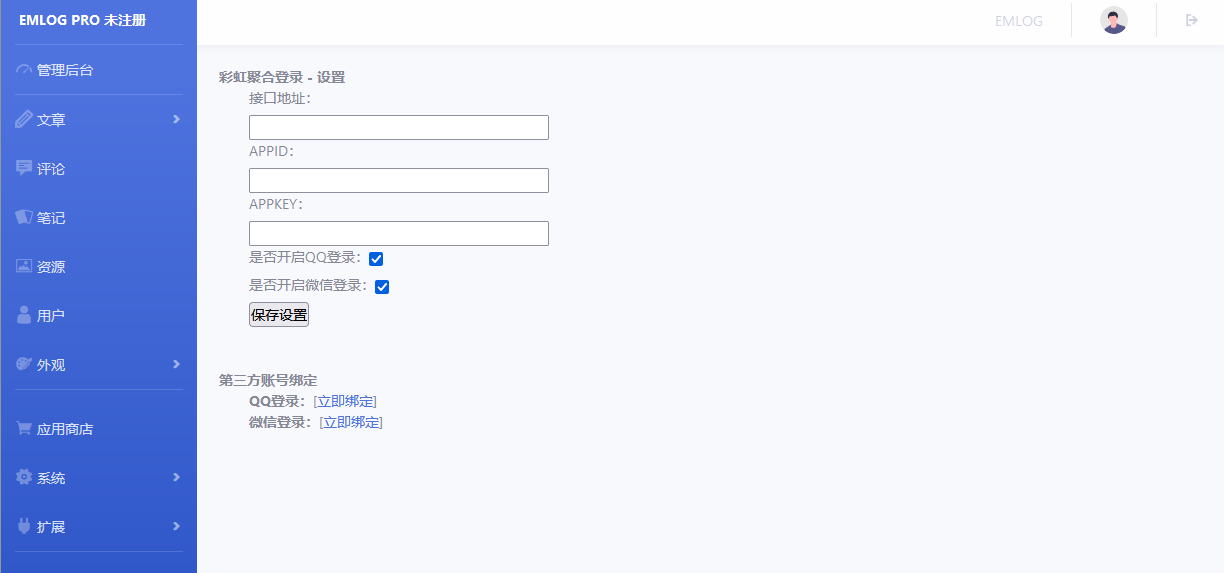 彩虹聚合登录可以免申请实现QQ、微信等快捷登录,使用方法:上传到 /content/plugins 目录解压,然后在后台插件列表开启,包含QQ和微信登录方式,由于emlog对于用户权限的控制问题,仅支持管理员或作者账号绑定快捷登录。 声明:本站所有资源均来源于互联网收集,仅供学习参考使用,如若本站内容侵犯了原著者的合法权益,可联系我们进行处理。