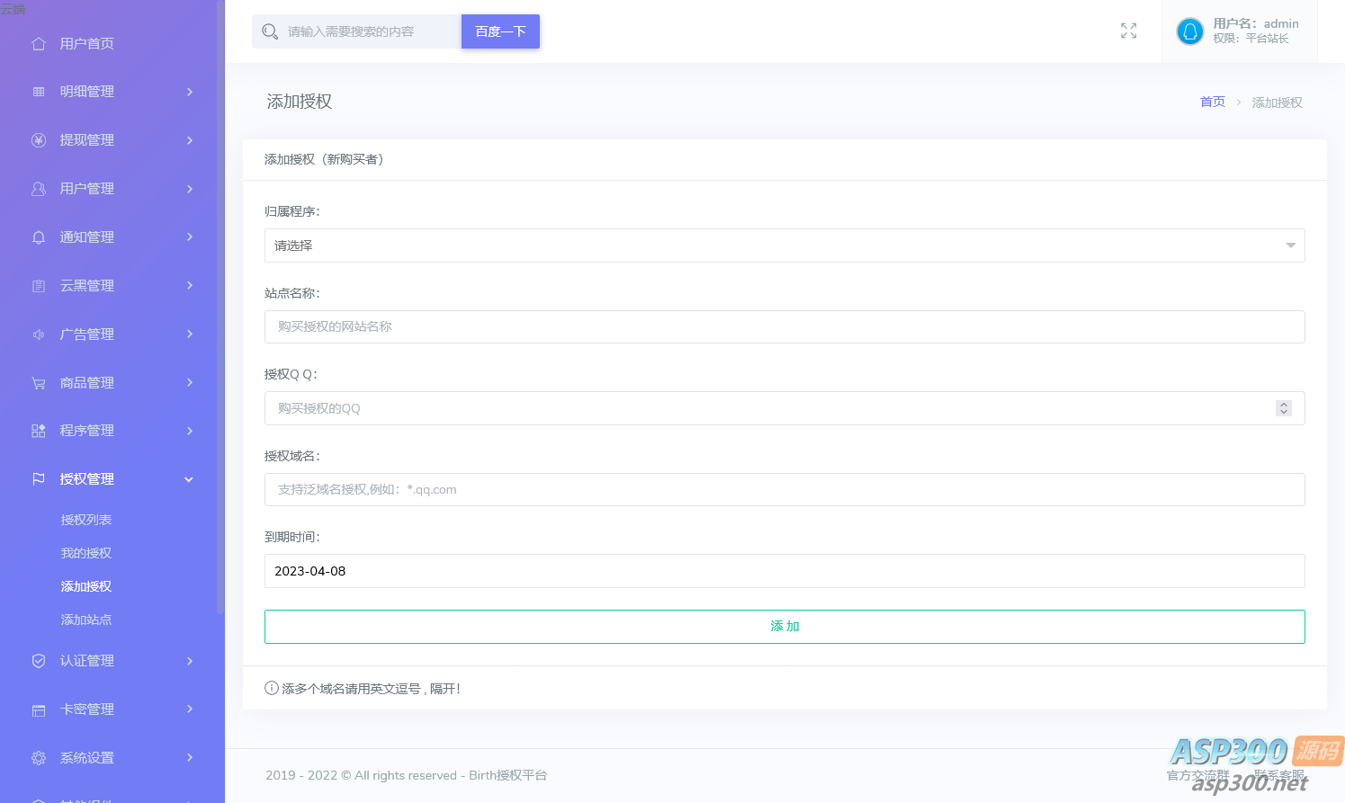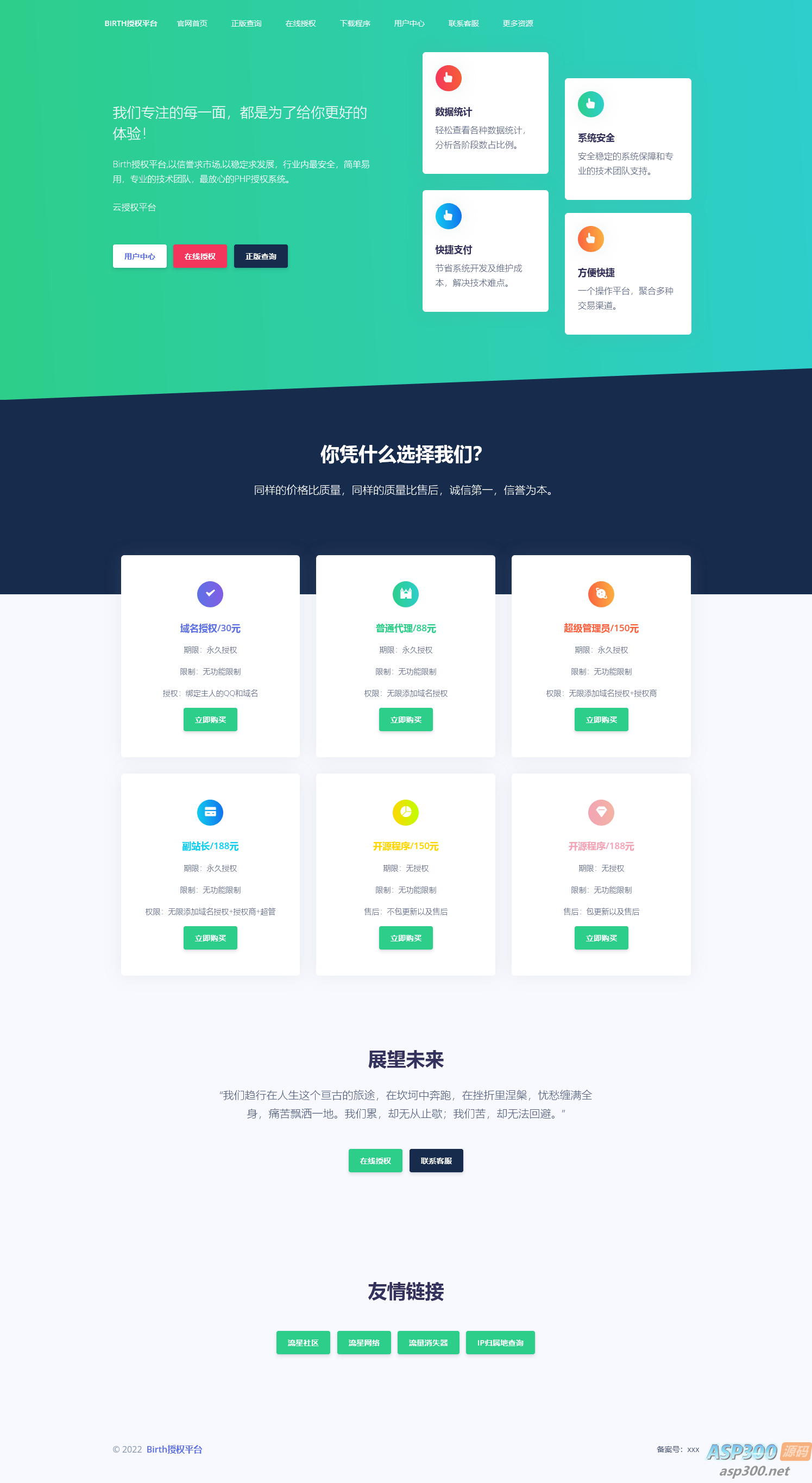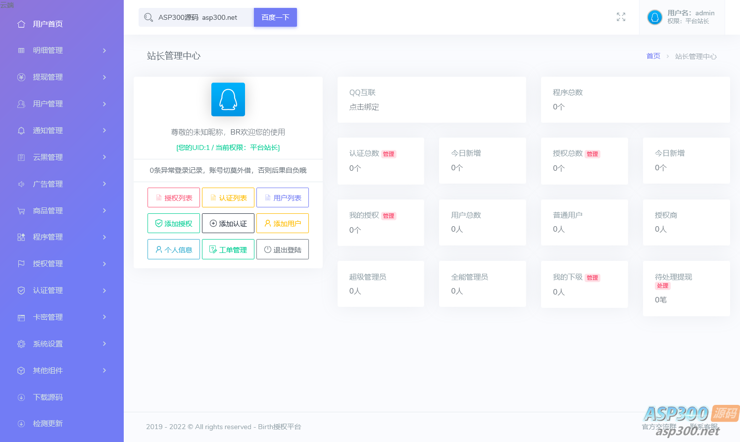 栀子花授权系统(Birth授权系统重铸版),本系统支持泛域名授权,单域名授权,多程序授权,在线更新,盗版入库,API对接,检测授权,站点记录,卡密系统,代理系统等多种主流/小众功能,以信誉求市场,以稳定求发展,行业内最安全,简单易用,专业的技术团队,最放心的PHP授权系统。