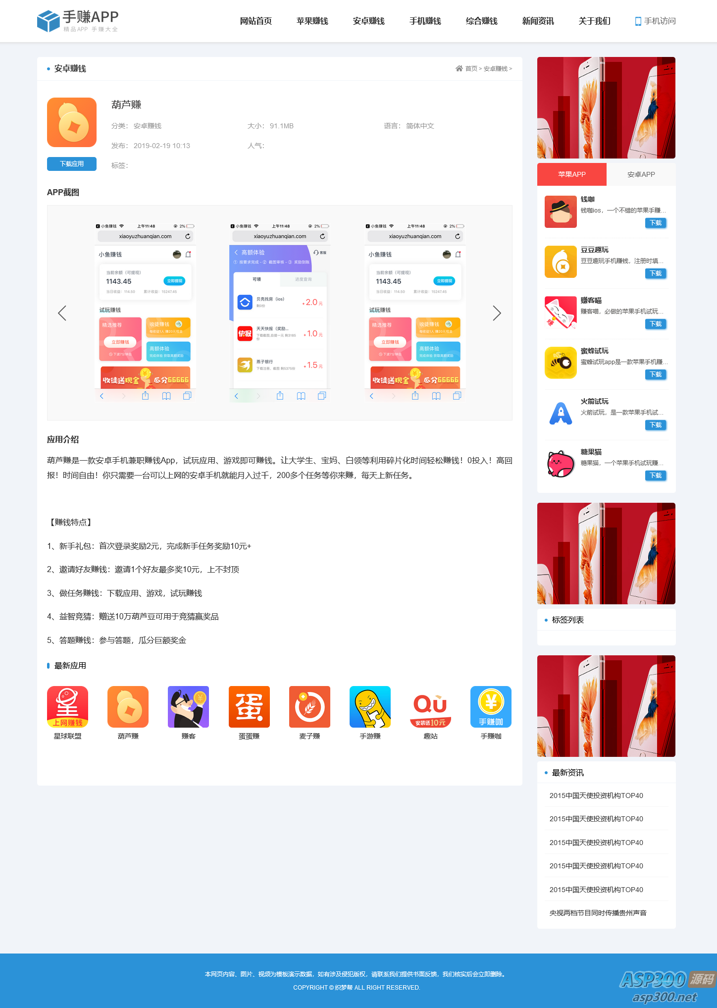 一款简洁蓝色的手机软件应用app下载排行,app下载平台,最新手机app发布网站响应式织梦模板。 主要有:主页、app列表页、app介绍详情页、新闻资讯列表、新闻详情页、关于我们等模块页面。 声明:本站所有资源均来源于互联网收集,仅供学习参考使用,如若本站内容侵犯了原著者的合法权益,可联系我们进行处理。