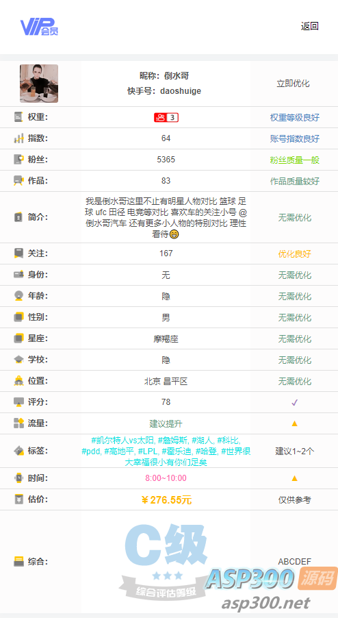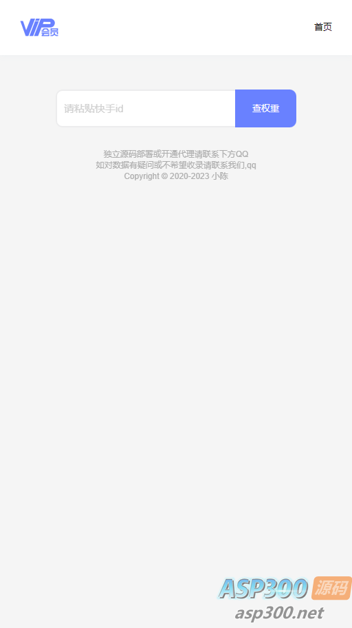 最近很多的快手权重查询,输入快手id即可查询权重,是否被限流等等,优化算法,上传源码解压即可使用,要是想修改水印请修改13行,如果想关闭查询限制请删除128~141行。 新增: 统计访问用户ip,停留时间,导入sql然后修改config.php即可 声明:本站所有资源均来源于互联网收集,仅供学习参考使用,如若本站内容侵犯了原著者的合法权益,可联系我们进行处理。