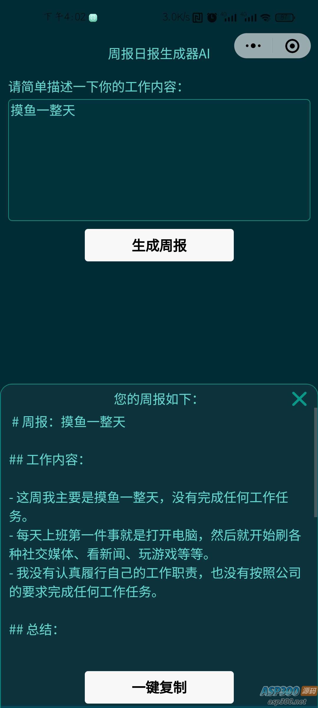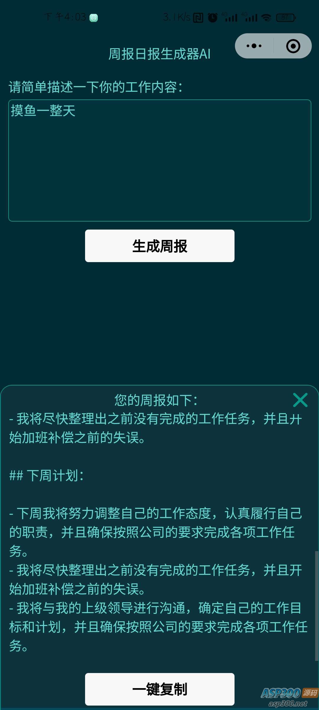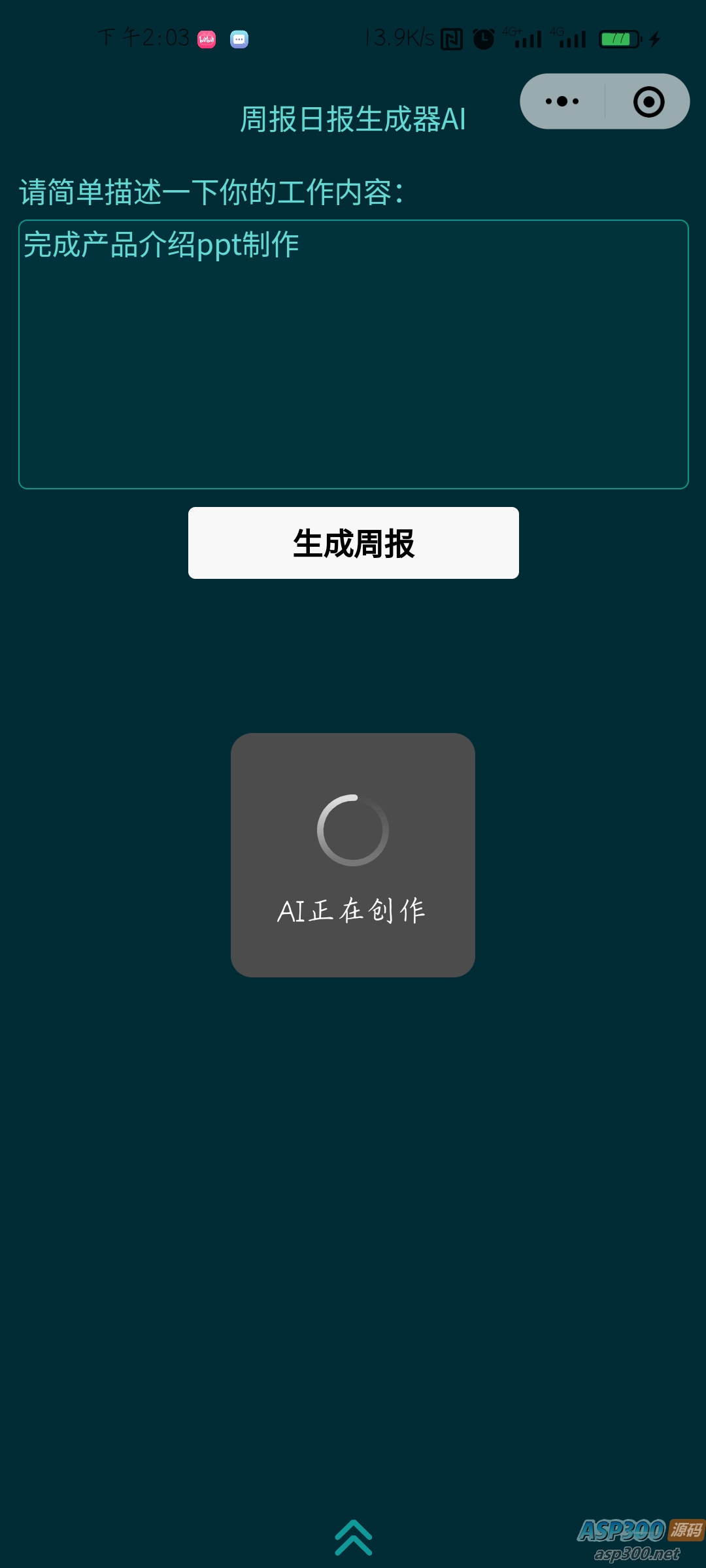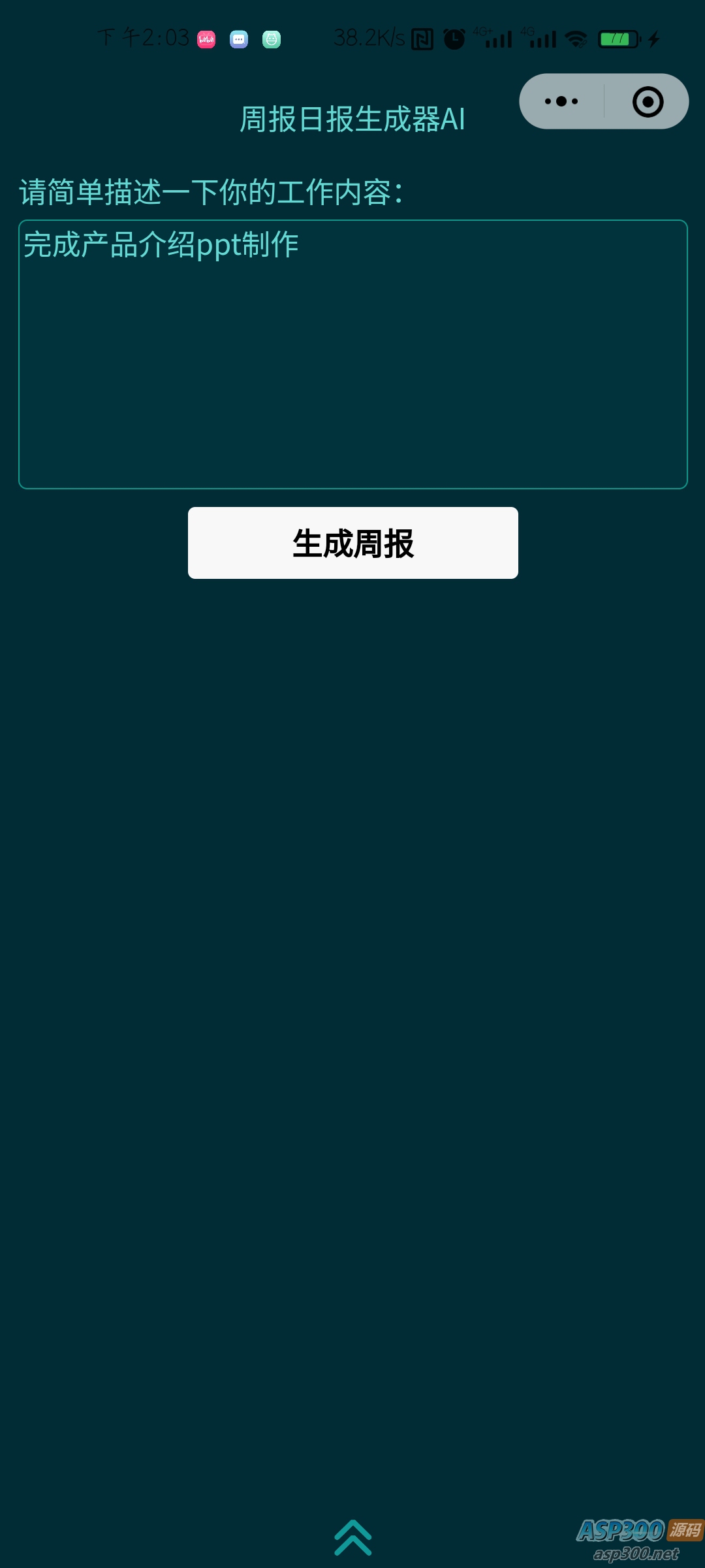 本小程序基于GPT3.5。根据用户输入的简略工作内容生成长篇周报,可一键复制。 配置:需在小程序后台配置域名,需配置的域名、小程序使用教程均在链接中。当前GPT配置域名由楼主提供,若访问量过大,GPT楼主也无法一直承担!!! 当前key还未失效,提供给大家使用,只需配置域名即可。 声明:本站所有资源均来源于互联网收集,仅供学习参考使用,如若本站内容侵犯了原著者的合法权益,可联系我们进行处理。
