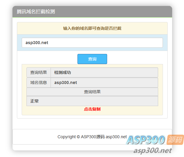 可以检测域名是否被腾讯的微信和QQ拦截,程序非常的轻量级,就一个HTML文件和一些CSS/JS啥的,上传到服务器就可以使用了。