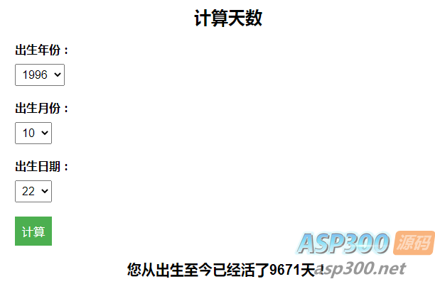 引流HTML单页面,选择出生年月日,然后计算出自己从出生至今活了多天。 单页面,下载源码上传自己服务器即可。 声明:本站所有资源均来源于互联网收集,仅供学习参考使用,如若本站内容侵犯了原著者的合法权益,可联系我们进行处理。