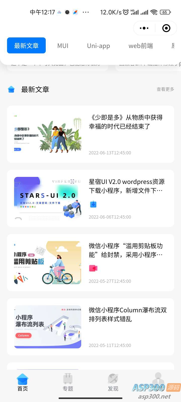 第一个小程序为星宿小程序 目前是最新版2.0 搭建星宿需要:备用域名 服务器 微信小程序账号 功能:文章展示 文章分类 资源链接下载 轮播图 直接下载附件功能 很多 很适合做资源类分享 声明:本站所有资源均来源于互联网收集,仅供学习参考使用,如若本站内容侵犯了原著者的合法权益,可联系我们进行处理。