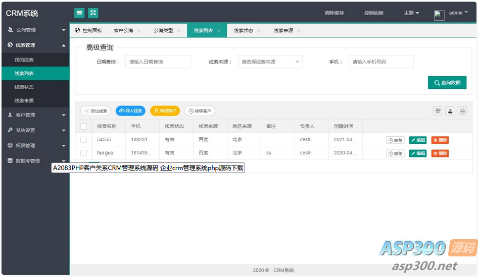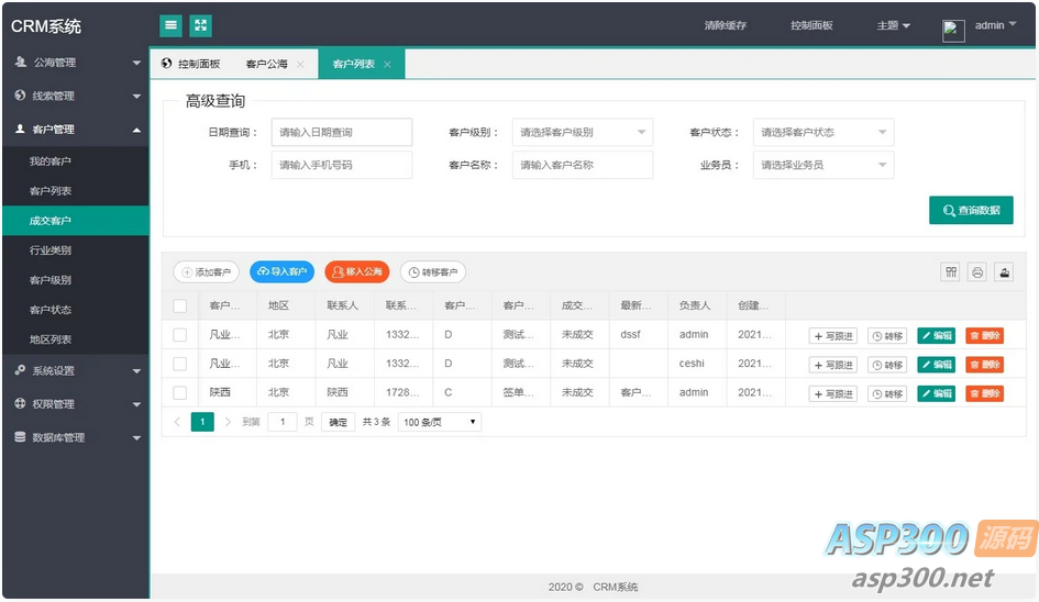系统功能实现 1、 公海管理:公海类型、客户公海。 2、 线索管理:我的线索、线索列表、线索状态、线索来源。 3、 客户管理:我的客户、客户列表、成交客户、行业类别、预查、地区列表、客户状态、客户级别。 4、 业绩订单:订单列表、我的订单。 5、 系统设置:系统设置、邮箱配置。 6、 权限管理:管理员列表、用户组列表、权限管理。 声明:本站所有资源均来源于互联网收集,仅供学习参考使用,如若本站内容侵犯了原著者的合法权益,可联系我们进行处理。