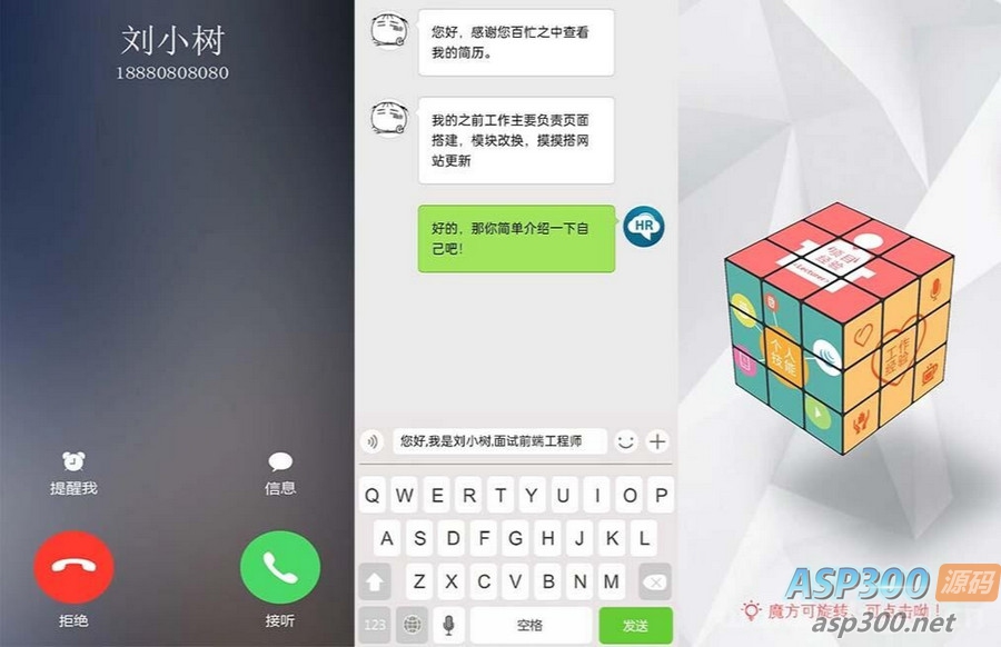 H5创意交互式个人简历手机页面模板html源码,具有来电式和聊天式交互方案,非常适合于个人使用。该模板可用于展示个人简历、技能介绍、作品展示以及联系方式等信息。