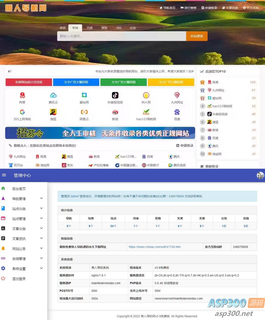自适应各终端懒人网址导航源码是一个以PHP+MySQL进行开发的网址导航源码。此版本是在原3.8版本的基础上修复和增加了些功能。新 人推荐直接使用新版本,舍弃旧版本,会二次开发的请对照后自行升级,后期会继续不定期更新。测试环境 宝塔Nginx -Tengine2.2.3 声明:本站所有资源均来源于互联网收集,仅供学习参考使用,如若本站内容侵犯了原著者的合法权益,可联系我们进行处理。