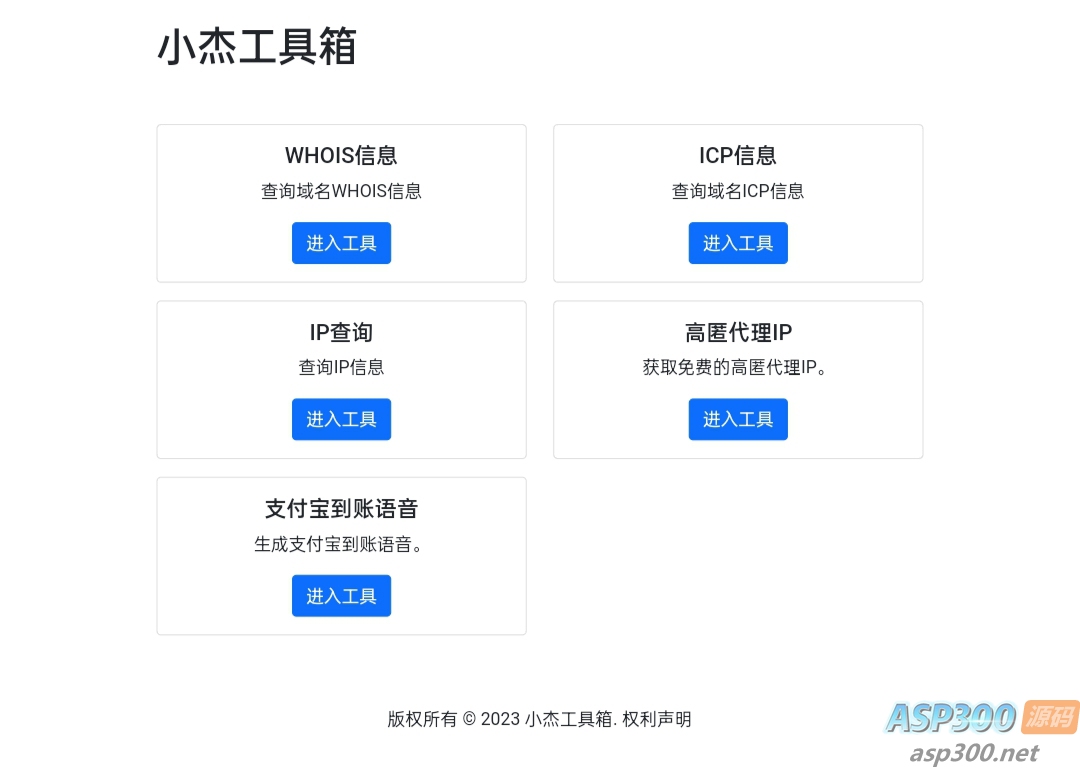 支持whois查询,icp查询,ip查询,支付宝到账语音合成等。 都是调用的api,页面是chatgpt生成的 声明:本站所有资源均来源于互联网收集,仅供学习参考使用,如若本站内容侵犯了原著者的合法权益,可联系我们进行处理。