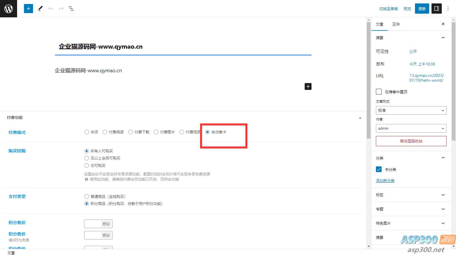 安装教程: 下载安装包之后直接在wp后台插件里面上传启用即可 具体功能: 可实现在线添加卡密信息 可设置积分购买、余额购买、暂不支持设置免费购买卡密 实时显示卡密库存 后台文章内自由设置售卡价格 仅支持登录购买 使用方法: 后台新建新文章,然后选择自动售卡 设置相关价格(不支持价格设置为0) 移动到编辑文章的底部(添加卡密信息) 直接发布文章即可显示售卡的文章 声明:本站所有资源均来源于互联网收集,仅供学习参考使用,如若本站内容侵犯了原著者的合法权益,可联系我们进行处理。