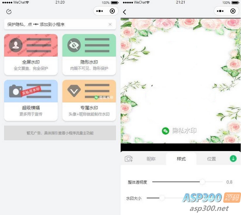 黎明加水印微信小程序源码,支持流量主接入。支持从聊天记录选择文件、相机拍摄、直接选择文件 · 支持白底、黑底的隐形水印,制作后,通过增加蒙版方能看到水印 · 纯前端,可嵌入任何项目。
